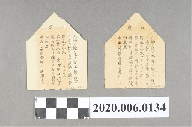 1.本物件為始政40週年紀念臺灣博覽會相關書籍與入場券,共有《始政四十周年記念臺灣博覽會會場案內》、《始政四十周年記念臺灣博覽會協賛會誌》、《始政四十周年記念臺灣博覽會誌》、《始政四十周年記念臺灣博覽會寫真帖》、《始政四十周年記念臺灣博覽會畫帖》等5本書,以及2張入場券、1張「半枚抽獎兌換券」。《始政四十周年記念臺灣博覽會會場案內》是由臺灣博覽會事務局編印,採平裝直式印刷,內文除目次外,主要記載4個會場及其所屬各館的展示品大要。《始政四十周年記念臺灣博覽會協賛會誌》是由臺灣博覽會協賛會編印,採精裝直式印刷