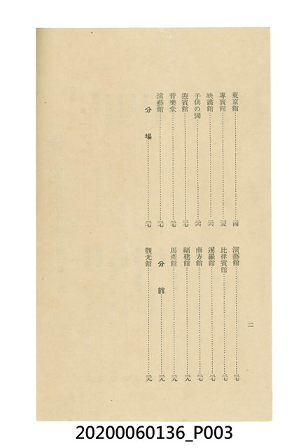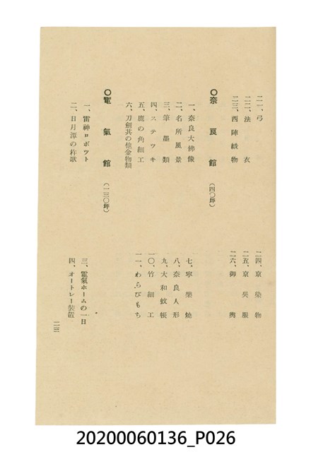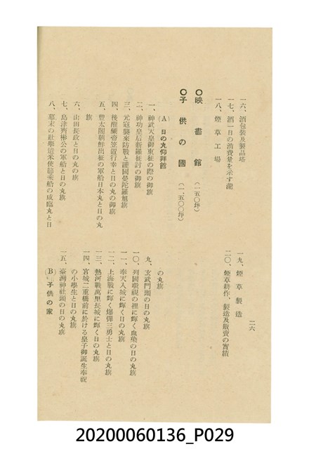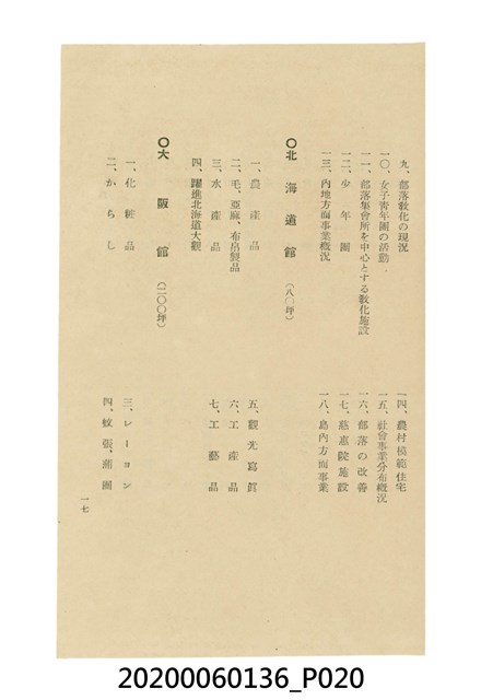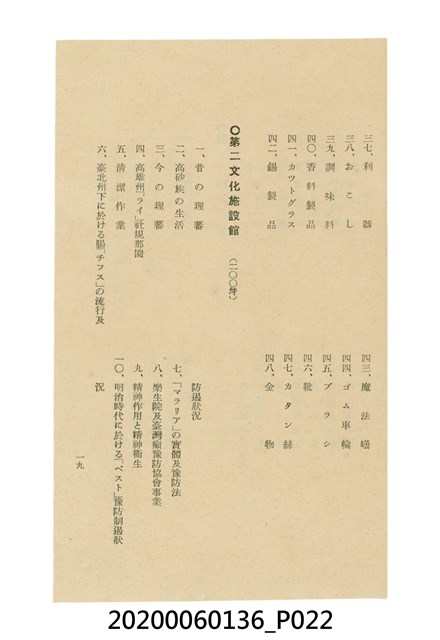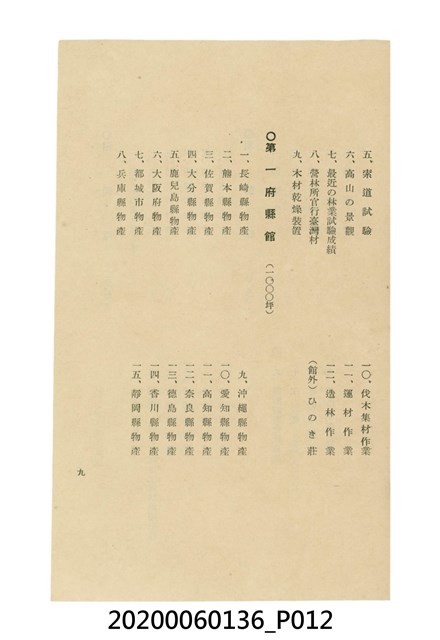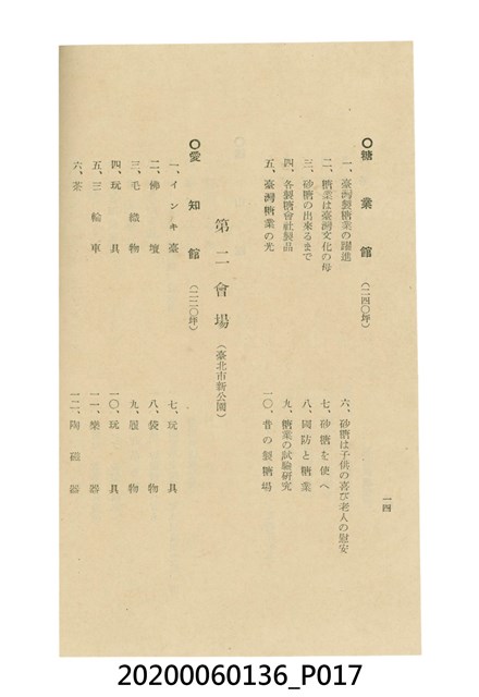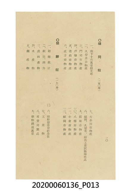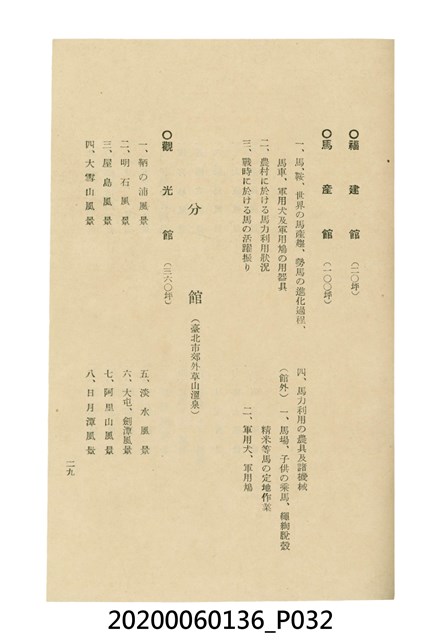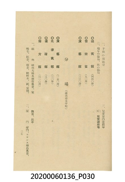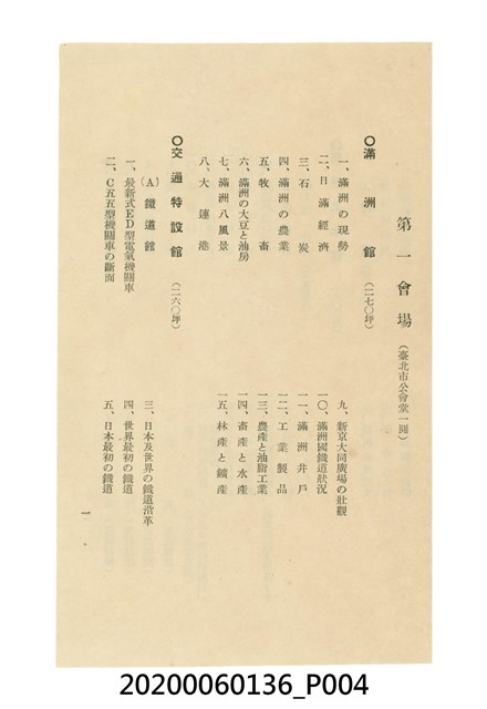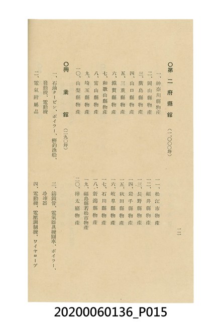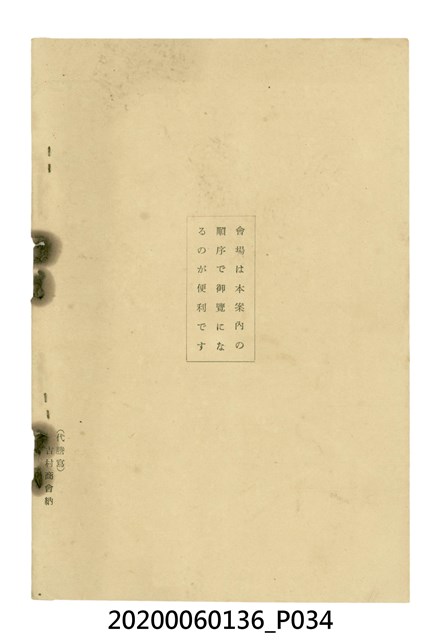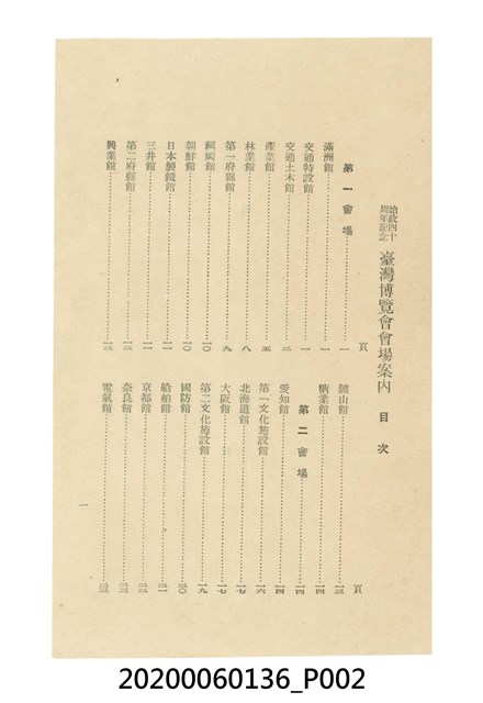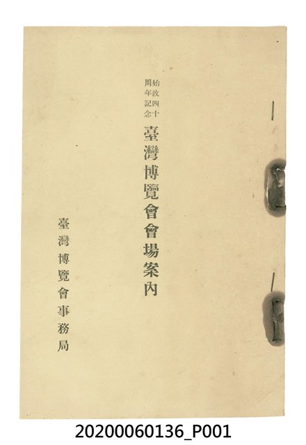 1.本物件為始政40週年紀念臺灣博覽會相關書籍與入場券,共有《始政四十周年記念臺灣博覽會會場案內》、《始政四十周年記念臺灣博覽會協賛會誌》、《始政四十周年記念臺灣博覽會誌》、《始政四十周年記念臺灣博覽會寫真帖》、《始政四十周年記念臺灣博覽會畫帖》等5本書,以及2張入場券、1張「半枚抽獎兌換券」。《始政四十周年記念臺灣博覽會會場案內》是由臺灣博覽會事務局編印,採平裝直式印刷,內文除目次外,主要記載4個會場及其所屬各館的展示品大要。《始政四十周年記念臺灣博覽會協賛會誌》是由臺灣博覽會協賛會編印,採精裝直式印刷,內文除序、目次、版權頁外,前半部附博覽會總裁、會長及協贊會幹部和顧問個別照片;內文分為總說、協贊會組織、設施事業概要、南方館大稻埕助成會、會計、殘物整理、博覽會之影響等7章;末附錄相關規程及役職員、地方委員名單,最末附會場平面圖及會場與相關活動照片。《始政四十周年記念臺灣博覽會誌》採精裝直式印刷,內文目次、版權頁外,內文之前附有2張博覽會海報、1套風景明信片及總督兼博覽會總裁中川健藏、總務長官兼博覽會會長平塚廣義的照片;內文分為總說、會務、協贊事業、整理事務、影響等5編,每編文字穿插相關照片;最末為2百多頁的附錄,收錄相關規程、展品目錄及受賞者名單、博覽會及協贊會役職員名錄。《始政四十周年記念臺灣博覽會寫真帖》封面、封底皆為紅色,採精裝膠裝,精裝硬殼外套有塑膠套。封面左下角由右而左橫印篆體之「始政四拾周年記念臺灣博覽會」字樣,右上角有臺灣博覽會圖案;封底中央有金色底圖圓框,原框內有飛鳥、山岳、船舶及總督府圖案。內頁封面以山岳及雲海為底圖,左上角有直印的書名;其後為總督兼博覽會總裁中川健藏照片及上百張會場及展覽品照片;封底內面貼有版權資料。《始政四十周年記念臺灣博覽會畫帖》封面、封底皆為紅色,採精裝線裝,封面有由右而左橫向燙金的「始政四十周年記念」、「臺灣博覽會畫帖」兩排字;內頁每頁有1張彩色或黑白照片,照片邊都附有日文解說。兩張入場券都呈正五角形,一以綠色為底色、一以藍色為底色。入場券中央均印有「普通入場券」字樣;右側印會期資訊,會期上覆蓋紅色圓印;左側印「始政四十周年記念臺灣博覽會」,字樣下方覆蓋紅色方印;上方有臺灣博覽會白色圖案底紋;下方印「貳拾錢」的票價資訊;綠色入場券上方覆印有紅色「れ組No.00888」流水號。抽獎兌換券以紅色為底色,為菊元百貨利用臺灣博覽會舉行之機,所進行的促銷活動;從上載資訊可知,只要購物滿50錢即可得到1張兌換券,集兩張兌換券,可換1張抽獎券;兌換券左側有圓框「榮」字樣,指的是菊元百貨所在位置榮町,亦有取老闆重田榮治姓名中的「榮」之意。2.總督府為宣傳其統治政績及臺灣各項政策的成果,於1935年10月10日至11月28日舉辦為期50天的「始政四十周年紀念臺灣博覽會」,舉辦地點以臺北為主,分為第一會場、第二會場、草山分館、分場等4個會場。第一會場位於臺北公會堂附近及其以南三線道路,設置滿州、交通特設、交通土木、產業、林業、第一府縣、福岡、朝鮮、日本製鐵、三井、第二府縣、興業、鑛山、糖業等14個館;第二會場位於臺北市公園(今二二八和平公園),設置愛知、第一文化設施、北海道、大阪、第二文化設施、國防、船舶、京都、奈良、電氣、東京、專賣、映畫、子供之國、迎賓、音樂、演藝等17個場館;草山分館位於北投草山溫泉區,設觀光館,介紹臺灣及日本重要觀光景點;設演藝、菲律賓、暹羅、南方、福建、馬產等6個館;分場位於大稻埕,而各地政府也各自舉辦小規模的展覽和活動。此外,各地方亦設有地方特色的展覽館。3.菊元百貨位於今臺北市衡陽路與博愛路路口的國泰金融大樓,為臺灣第1家百貨公司。其為日本山口縣出身的商人重田榮治所創立,於1932年12月正式開幕營業。其建築樓高6層,加上頂樓的瞭望臺,號稱「七重天」;並且擁有臺灣第5個商用升降梯,以及負責操作的電梯小姐,吸引不少人潮參觀,是熱門的觀光景點