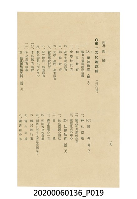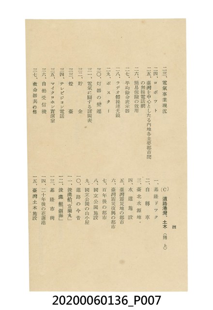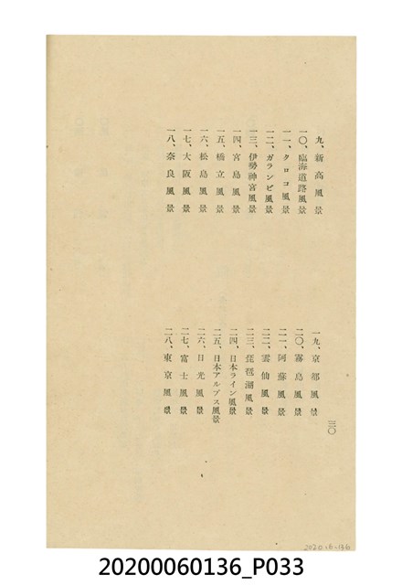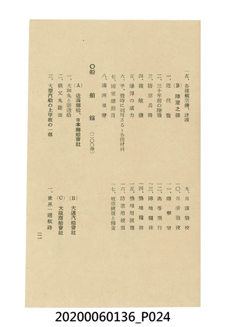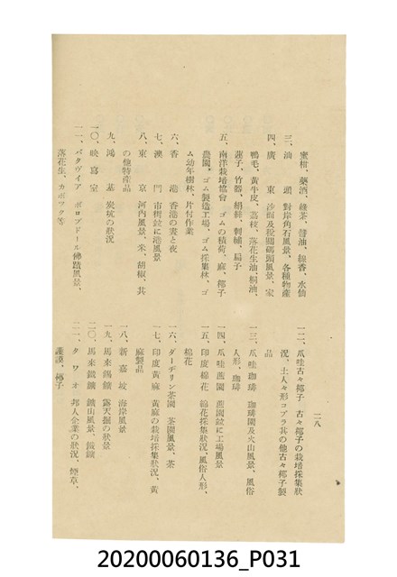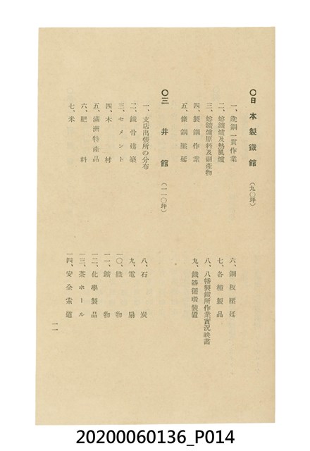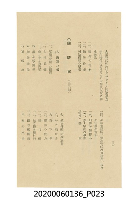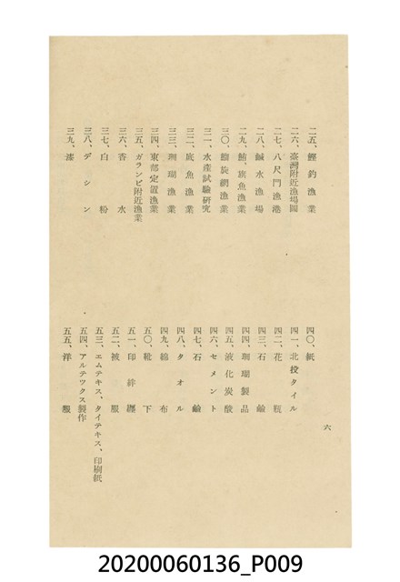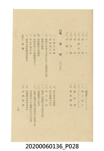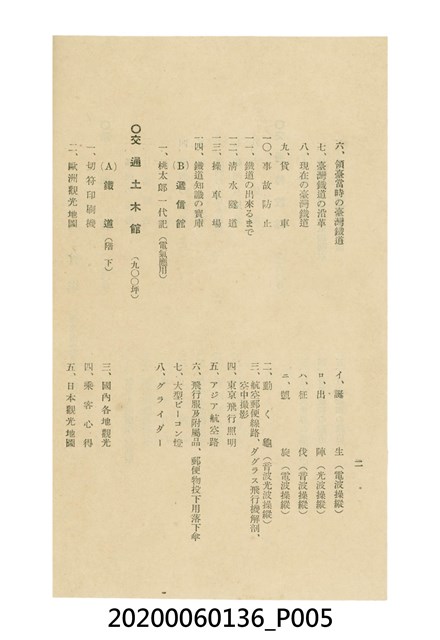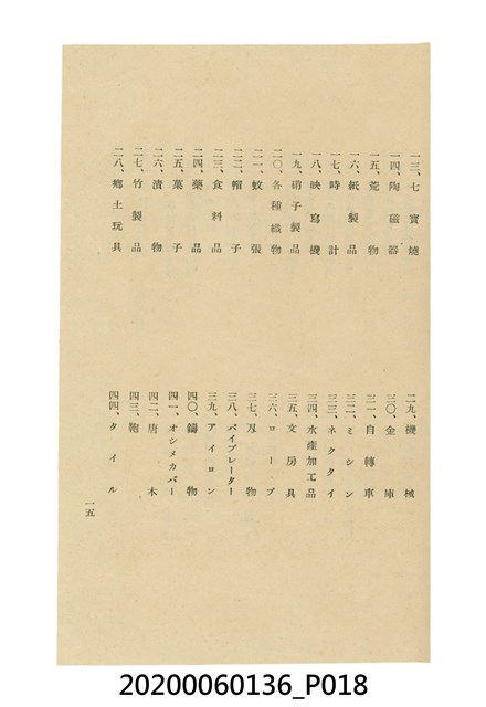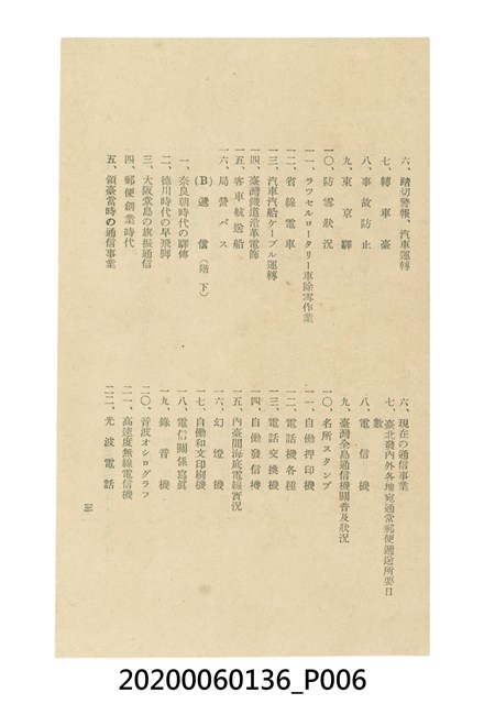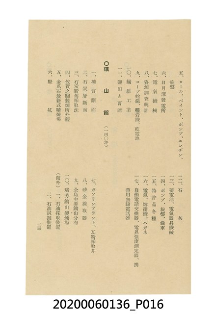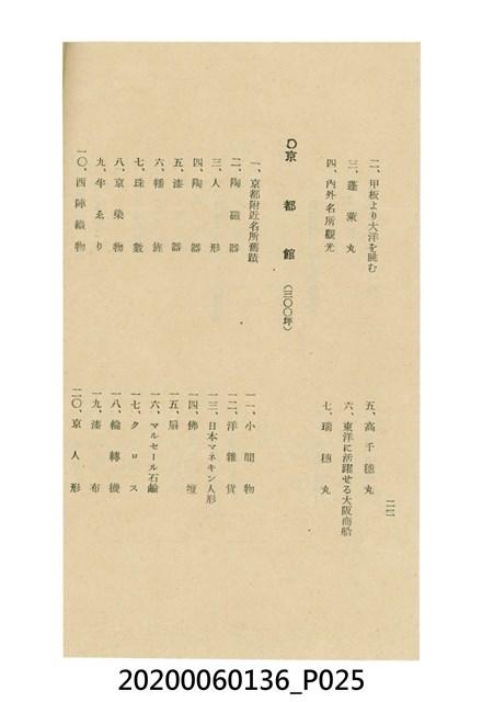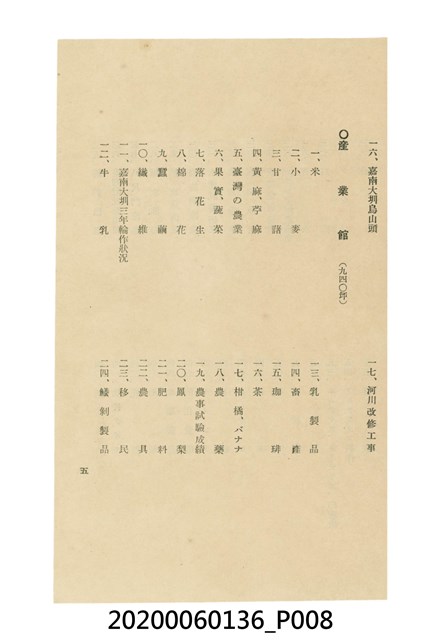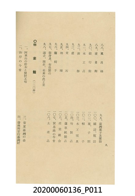 1.本物件為始政40週年紀念臺灣博覽會相關書籍與入場券,共有《始政四十周年記念臺灣博覽會會場案內》、《始政四十周年記念臺灣博覽會協賛會誌》、《始政四十周年記念臺灣博覽會誌》、《始政四十周年記念臺灣博覽會寫真帖》、《始政四十周年記念臺灣博覽會畫帖》等5本書,以及2張入場券、1張「半枚抽獎兌換券」。《始政四十周年記念臺灣博覽會會場案內》是由臺灣博覽會事務局編印,採平裝直式印刷,內文除目次外,主要記載4個會場及其所屬各館的展示品大要。《始政四十周年記念臺灣博覽會協賛會誌》是由臺灣博覽會協賛會編印,採精裝直式印刷,內文除序、目次、版權頁外,前半部附博覽會總裁、會長及協贊會幹部和顧問個別照片;內文分為總說、協贊會組織、設施事業概要、南方館大稻埕助成會、會計、殘物整理、博覽會之影響等7章;末附錄相關規程及役職員、地方委員名單,最末附會場平面圖及會場與相關活動照片。《始政四十周年記念臺灣博覽會誌》採精裝直式印刷,內文目次、版權頁外,內文之前附有2張博覽會海報、1套風景明信片及總督兼博覽會總裁中川健藏、總務長官兼博覽會會長平塚廣義的照片;內文分為總說、會務、協贊事業、整理事務、影響等5編,每編文字穿插相關照片;最末為2百多頁的附錄,收錄相關規程、展品目錄及受賞者名單、博覽會及協贊會役職員名錄。《始政四十周年記念臺灣博覽會寫真帖》封面、封底皆為紅色,採精裝膠裝,精裝硬殼外套有塑膠套。封面左下角由右而左橫印篆體之「始政四拾周年記念臺灣博覽會」字樣,右上角有臺灣博覽會圖案;封底中央有金色底圖圓框,原框內有飛鳥、山岳、船舶及總督府圖案。內頁封面以山岳及雲海為底圖,左上角有直印的書名;其後為總督兼博覽會總裁中川健藏照片及上百張會場及展覽品照片;封底內面貼有版權資料。《始政四十周年記念臺灣博覽會畫帖》封面、封底皆為紅色,採精裝線裝,封面有由右而左橫向燙金的「始政四十周年記念」、「臺灣博覽會畫帖」兩排字;內頁每頁有1張彩色或黑白照片,照片邊都附有日文解說。兩張入場券都呈正五角形,一以綠色為底色、一以藍色為底色。入場券中央均印有「普通入場券」字樣;右側印會期資訊,會期上覆蓋紅色圓印;左側印「始政四十周年記念臺灣博覽會」,字樣下方覆蓋紅色方印;上方有臺灣博覽會白色圖案底紋;下方印「貳拾錢」的票價資訊;綠色入場券上方覆印有紅色「れ組No.00888」流水號。抽獎兌換券以紅色為底色,為菊元百貨利用臺灣博覽會舉行之機,所進行的促銷活動;從上載資訊可知,只要購物滿50錢即可得到1張兌換券,集兩張兌換券,可換1張抽獎券;兌換券左側有圓框「榮」字樣,指的是菊元百貨所在位置榮町,亦有取老闆重田榮治姓名中的「榮」之意。2.總督府為宣傳其統治政績及臺灣各項政策的成果,於1935年10月10日至11月28日舉辦為期50天的「始政四十周年紀念臺灣博覽會」,舉辦地點以臺北為主,分為第一會場、第二會場、草山分館、分場等4個會場。第一會場位於臺北公會堂附近及其以南三線道路,設置滿州、交通特設、交通土木、產業、林業、第一府縣、福岡、朝鮮、日本製鐵、三井、第二府縣、興業、鑛山、糖業等14個館;第二會場位於臺北市公園(今二二八和平公園),設置愛知、第一文化設施、北海道、大阪、第二文化設施、國防、船舶、京都、奈良、電氣、東京、專賣、映畫、子供之國、迎賓、音樂、演藝等17個場館;草山分館位於北投草山溫泉區,設觀光館,介紹臺灣及日本重要觀光景點;設演藝、菲律賓、暹羅、南方、福建、馬產等6個館;分場位於大稻埕,而各地政府也各自舉辦小規模的展覽和活動。此外,各地方亦設有地方特色的展覽館。3.菊元百貨位於今臺北市衡陽路與博愛路路口的國泰金融大樓,為臺灣第1家百貨公司。其為日本山口縣出身的商人重田榮治所創立,於1932年12月正式開幕營業。其建築樓高6層,加上頂樓的瞭望臺,號稱「七重天」;並且擁有臺灣第5個商用升降梯,以及負責操作的電梯小姐,吸引不少人潮參觀,是熱門的觀光景點