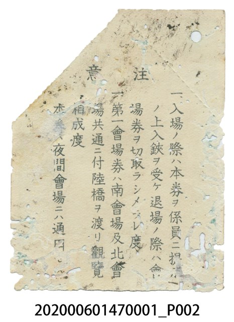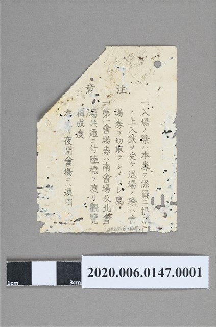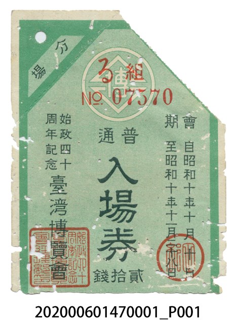 1.本物件為始政四十周年臺灣博覽會發行各式入場券,包含了3張不同顏色的入場卷,所有物件皆保存良好。2.始政四十周年記念臺灣博覽會,簡稱臺灣博覽會,是1935年日本統治臺灣40週年時,於該年10月10日至11月28日此50日期間在臺灣各地所舉辦的博覽會,也是臺灣有史以來第1次舉辦全島大型博覽會,同時也是臺灣史上最大型的活動。臺灣總督府在每十年的施政紀念日 (日人稱為「始政記念日」)舉辦展覽會或博覽會這類的紀念性活動,1935年是第四回,其目的在於展現40年來日本政府在臺灣實施的各項建設成果,大力邀請周邊各國和地區參展,讓各國知曉臺灣各種進步情形經濟建設等等。
