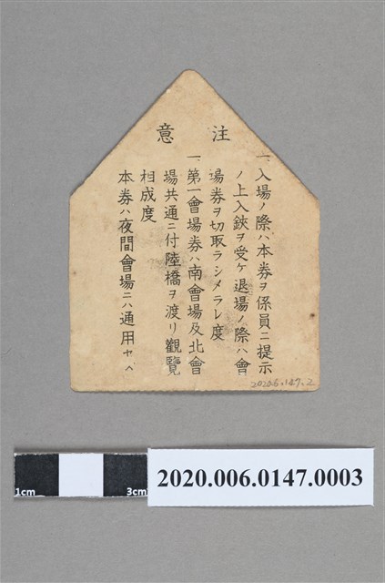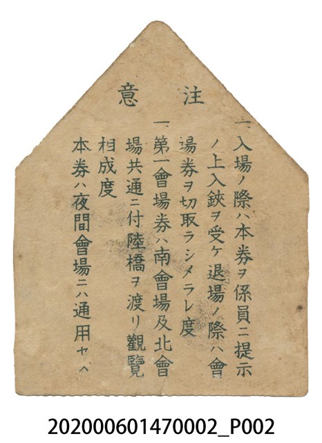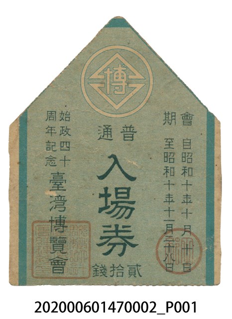 1.本物件為始政四十周年臺灣博覽會發行各式入場券,包含了3張不同顏色的入場卷,所有物件皆保存良好。2.始政四十周年記念臺灣博覽會,簡稱臺灣博覽會,是1935年日本統治臺灣40週年時,於該年10月10日至11月28日此50日期間在臺灣各地所舉辦的博覽會,也是臺灣有史以來第1次舉辦全島大型博覽會,同時也是臺灣史上最大型的活動。臺灣總督府在每十年的施政紀念日 (日人稱為「始政記念日」)舉辦展覽會或博覽會這類的紀念性活動,1935年是第四回,其目的在於展現40年來日本政府在臺灣實施的各項建設成果,大力邀請周邊各國和地區參展,讓各國知曉臺灣各種進步情形經濟建設等等。