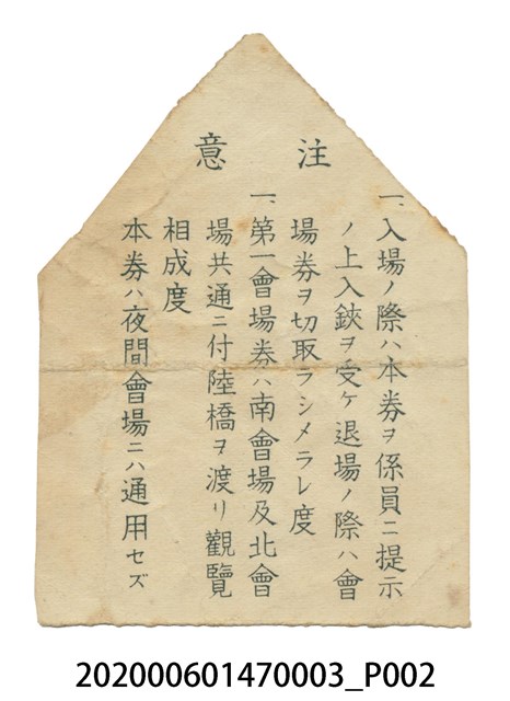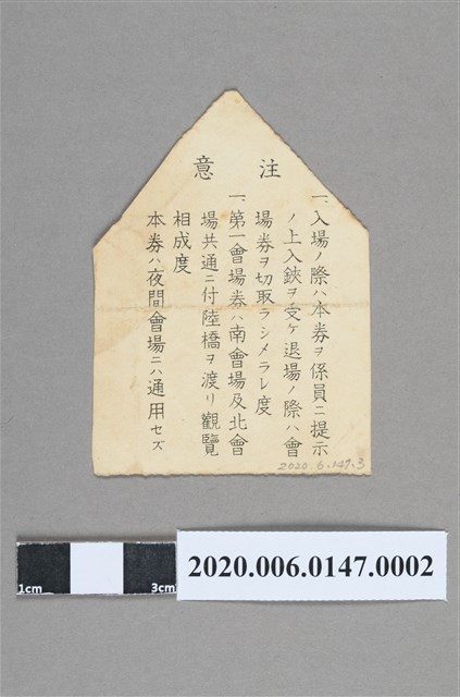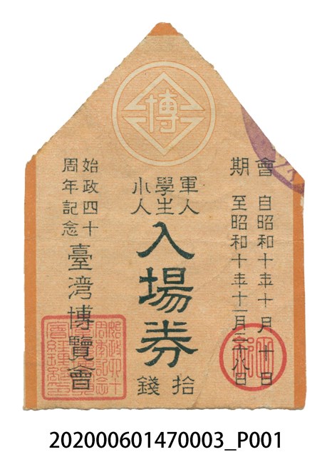 1.本物件為始政四十周年臺灣博覽會發行各式入場券,包含了3張不同顏色的入場卷,所有物件皆保存良好。2.始政四十周年記念臺灣博覽會,簡稱臺灣博覽會,是1935年日本統治臺灣40週年時,於該年10月10日至11月28日此50日期間在臺灣各地所舉辦的博覽會,也是臺灣有史以來第1次舉辦全島大型博覽會,同時也是臺灣史上最大型的活動。臺灣總督府在每十年的施政紀念日 (日人稱為「始政記念日」)舉辦展覽會或博覽會這類的紀念性活動,1935年是第四回,其目的在於展現40年來日本政府在臺灣實施的各項建設成果,大力邀請周邊各國和地區參展,讓各國知曉臺灣各種進步情形經濟建設等等。