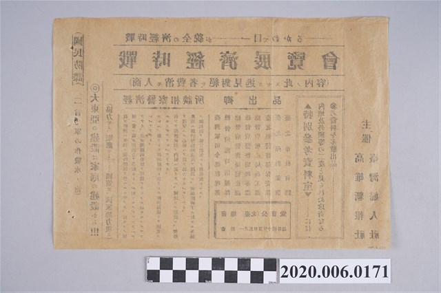 1.本件長25.5公分、寬17.5公分、高0.1公分。本件為海報宣傳品,為高雄新報社與臺灣婦人社主辦之「戰時經濟展覽會」的海報,該份文宣寫著需要「國民防諜」,也提到大東亞建設為從家庭建設開始。強調在國家總力戰的情況下,應該要協力、要順應國策,並提及戰時體制下的經濟經過調整,但經濟仍有萎縮的狀況,特別設置經濟警察諮詢,以便在統制經濟的狀態下,藉由警察指導與諮詢得到改善。本件雖為民間社教團體主辦,但也有眾多官方單位協助,如臺灣軍司令部經理部、臺灣總督府的臨時情報客、警務局、殖產局,以及臺北州勸業課、臺北市社會課等。2.大東亞建設,應概念源自1938年11月3日,大日本帝國總理大臣近衛文麿發表「第二次近衛聲明」,號召建立「大東亞新秩序」,欲樹立「中日滿三國相互提攜,建立政治、經濟、文化等方面的互助連環關係」。1940年8月,近衛文麿首度明白指出「大東亞共榮圈」的名稱,而大東亞秩序以日本天皇為中心,初期大東亞共榮圈原本具有承認圈內各民族獨立的協同意向,但1942年後,轉為合理化的侵略藉口。