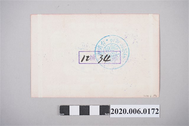 1.本件長12.4公分、寬8公分、高0.1公分。本件為紅底綠字的音樂演奏會票根。主辦為臺灣省博覽會,音樂會演奏者為臺灣省交響樂團,曲目為「悲多汶第九交響曲」,此處的「悲多汶」為翻譯,推測應為「貝多芬」,即貝多芬第九號交響曲,票價為5000元,因主要是臺灣博覽會期間的演奏會,因此雖然票根時間僅寫「10月27日下午8時起」,可以合理推斷為1948年10月27日。音樂會地點為臺北的中山堂。本件上蓋有「贈券」及單位模糊的總務處會計股的橢圓戳章。票根背面則有「12排34號」的座位,以及模糊的臺灣省某單位出納組的原戳章。2.臺灣省博覽自1948年10月25日開幕迄12月5日閉幕,為期六週。該博覽會最重要是重申其上任臺灣省主席的首要施政方針「安定中求繁榮」(因1947年才剛爆發228事件),另一部份則是檢討臺灣三年來建設之進度,與省外觀摩切磋,並使臺胞愈益瞭解祖國文物及本省實況。當時省府以免費或優待票方式動員軍憲警及學生團體、民間社團、旅外臺胞等參觀臺灣博覽會。