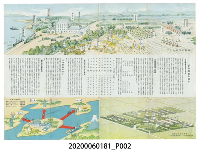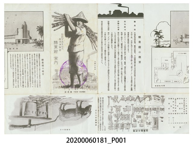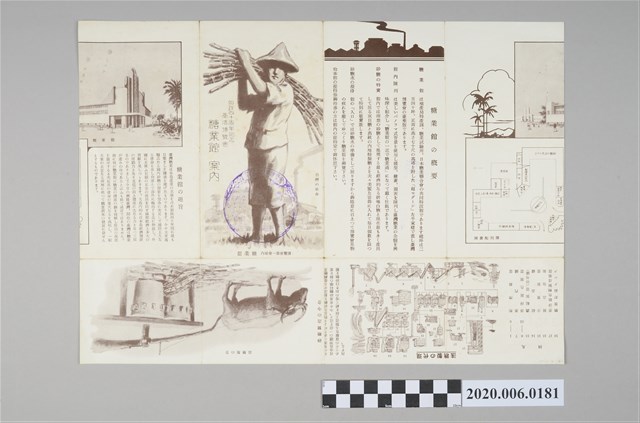 1.本物件為始政四十週年紀念臺灣博覽會糖業館導覽手冊,為4摺的摺頁說明,從最右邊開始畫有博覽會的陳列配置圖,再來是有關糖業館的概要解說,左邊畫有1男士肩背甘蔗,旁邊印有「始政四十周年記念臺灣博覽會 糖業館案內」,並蓋有博覽會印戳,最左邊則為糖業館的趣旨,整個物件保存尚可。2.始政四十周年記念臺灣博覽會,簡稱臺灣博覽會,是1935年日本統治臺灣40週年時,於該年10月10日至11月28日此50日期間在臺灣各地所舉辦的博覽會,也是臺灣有史以來第1次舉辦全島大型博覽會,同時也是臺灣史上最大型的活動。臺灣總督府在每十年的施政紀念日 (日人稱為「始政記念日」)舉辦展覽會或博覽會這類的紀念性活動,1935年是第四回,其目的在於展現40年來日本政府在臺灣實施的各項建設成果,大力邀請周邊各國和地區參展,讓各國知曉臺灣各種進步情形經濟建設等等。