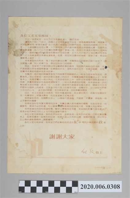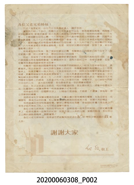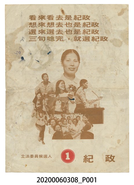 1.本件為立法委員候選人紀政文宣傳單,中間印有紀政及其與選民互動之照片,上方寫著「看來看去是紀政 想來想去也是紀政 三句唸完 就選紀政」字樣。2.紀政1944年3月15日出生於新竹市牛埔農村,為中華民國前奧運田徑運動員,爆發力強,專長於短跑、跨欄、跳高、跳遠等田徑運動,「飛躍的羚羊」、「黃色閃電」,曾任中國國民黨立法委員、中華民國無任所大使、總統府國策顧問、臺北市政府市政顧問等職務。