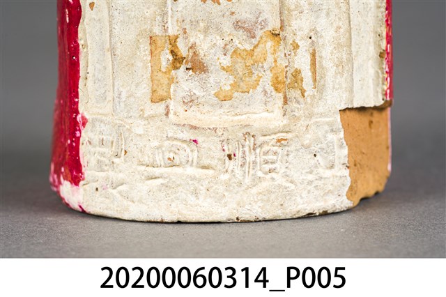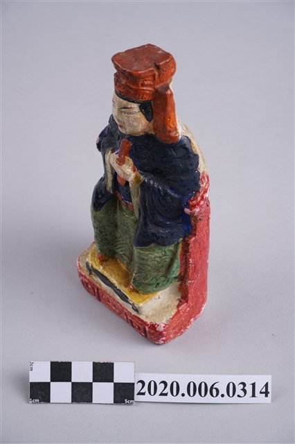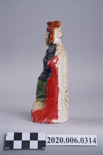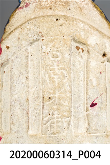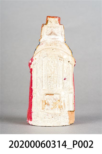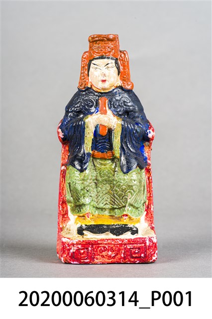 本件為陶製臺南米街媽祖神像,尺寸長6.2公分、寬4.7公分、高15公分。本件為上釉藥(礦物釉)燒製成彩陶,媽祖有頂冠、身著藍衣、綠裙、紅鞋,採用坐姿,雙手手持紅色奏版(神笏)。本件背面為全白色,在正中央刻有「台南米街」字樣,下緣則有「正順興製」字樣。