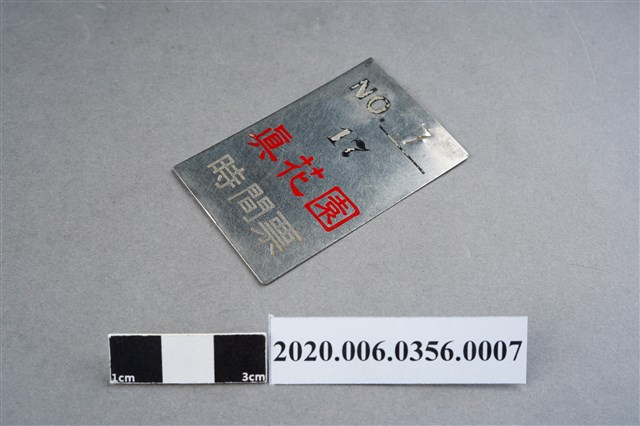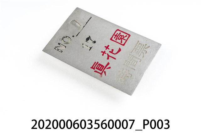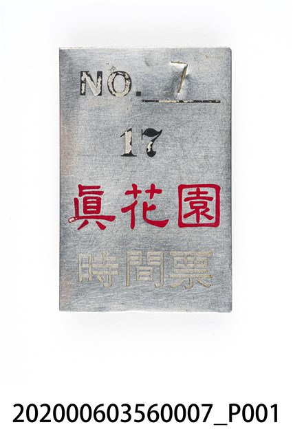 1.本物件為真花園宿夜票與時間票,為鐵製品,分為兩種,橘色字體的為時間票,藍色字體的為宿業票,兩者上面皆有號碼以及寫上「真花園」,旁邊有1個白色塑膠長方盒,可以將票券收納於此,整個物件保存完整。 2. 1907年日本頒布法令,准許台灣人開設妓院,1922年(大正11年)臺南州政府將臺南市內的貸座敷(妓院)集中在新町以便於管理和整頓風紀,1930年代,府城人戲稱『第一賣冰,第二醫生,第三新町,第四跤筲間』,足以印證特種行業極盛的曾經,隨著日本的戰敗,台灣經營者面臨政府1946年的廢除公娼、肅娼而難以為繼,最終僅存的日治時期享有盛名的妓女戶之二:新松金樓,已於2005年已經拆除;真花園(臺南市康樂街19號),1座完整的四合院建築,屋主在無力維修的情況下,於2009年05月20日拆下招牌,這也代表真花園是最後一間見證新町歷史的有牌妓女戶,走入歷史。