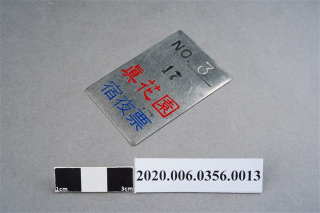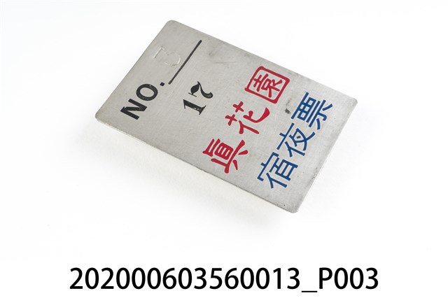 1.本物件為真花園宿夜票與時間票,為鐵製品,分為兩種,橘色字體的為時間票,藍色字體的為宿業票,兩者上面皆有號碼以及寫上「真花園」,旁邊有1個白色塑膠長方盒,可以將票券收納於此,整個物件保存完整。