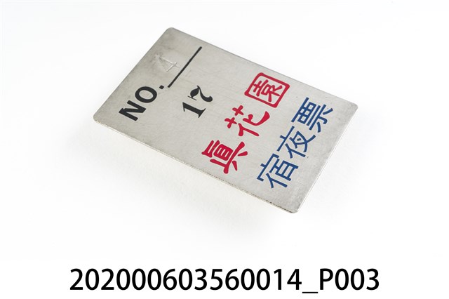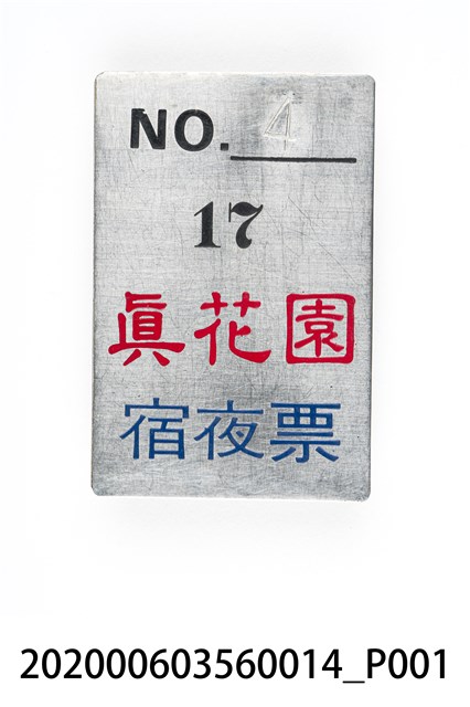 1.本物件為真花園宿夜票與時間票,為鐵製品,分為兩種,橘色字體的為時間票,藍色字體的為宿業票,兩者上面皆有號碼以及寫上「真花園」,旁邊有1個白色塑膠長方盒,可以將票券收納於此,整個物件保存完整。