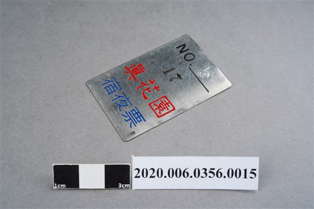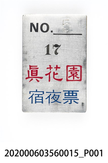 1.本物件為真花園宿夜票與時間票,為鐵製品,分為兩種,橘色字體的為時間票,藍色字體的為宿業票,兩者上面皆有號碼以及寫上「真花園」,旁邊有1個白色塑膠長方盒,可以將票券收納於此,整個物件保存完整。