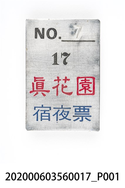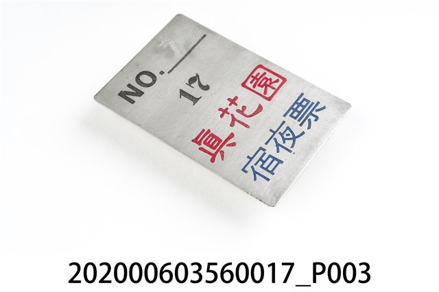 1.本物件為真花園宿夜票與時間票,為鐵製品,分為兩種,橘色字體的為時間票,藍色字體的為宿業票,兩者上面皆有號碼以及寫上「真花園」,旁邊有1個白色塑膠長方盒,可以將票券收納於此,整個物件保存完整。