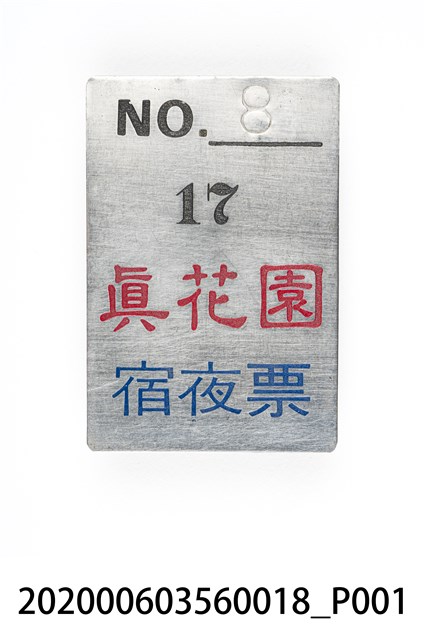 1.本物件為真花園宿夜票與時間票,為鐵製品,分為兩種,橘色字體的為時間票,藍色字體的為宿業票,兩者上面皆有號碼以及寫上「真花園」,旁邊有1個白色塑膠長方盒,可以將票券收納於此,整個物件保存完整。