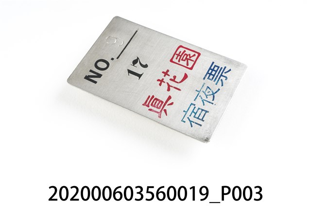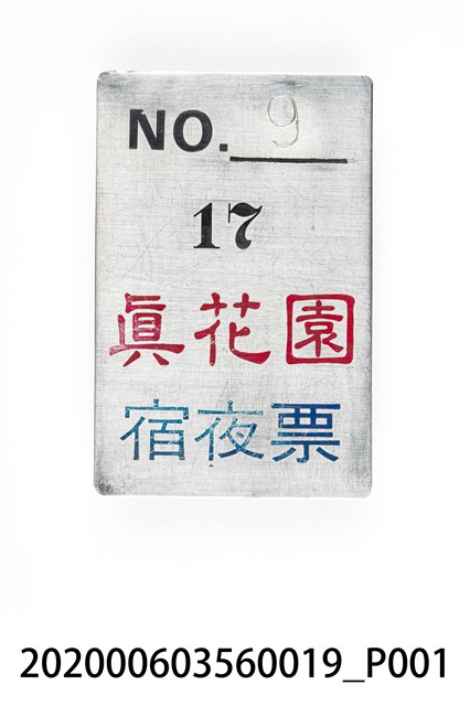 1.本物件為真花園宿夜票與時間票,為鐵製品,分為兩種,橘色字體的為時間票,藍色字體的為宿業票,兩者上面皆有號碼以及寫上「真花園」,旁邊有1個白色塑膠長方盒,可以將票券收納於此,整個物件保存完整。
