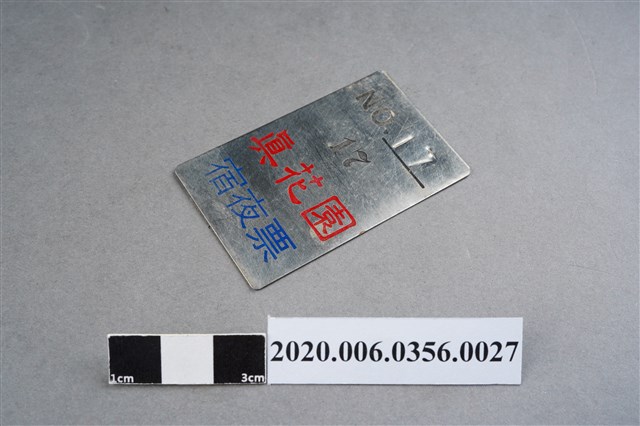 1.本物件為真花園宿夜票與時間票,為鐵製品,分為兩種,橘色字體的為時間票,藍色字體的為宿業票,兩者上面皆有號碼以及寫上「真花園」,旁邊有1個白色塑膠長方盒,可以將票券收納於此,整個物件保存完整。 2. 1907年日本頒布法令,准許台灣人開設妓院,1922年(大正11年)臺南州政府將臺南市內的貸座敷(妓院)集中在新町以便於管理和整頓風紀,1930年代,府城人戲稱『第一賣冰,第二醫生,第三新町,第四跤筲間』,足以印證特種行業極盛的曾經,隨著日本的戰敗,台灣經營者面臨政府1946年的廢除公娼、肅娼而難以為繼,最終僅存的日治時期享有盛名的妓女戶之二:新松金樓,已於2005年已經拆除;真花園(臺南市康樂街19號),1座完整的四合院建築,屋主在無力維修的情況下,於2009年05月20日拆下招牌,這也代表真花園是最後一間見證新町歷史的有牌妓女戶,走入歷史。
