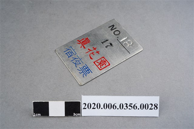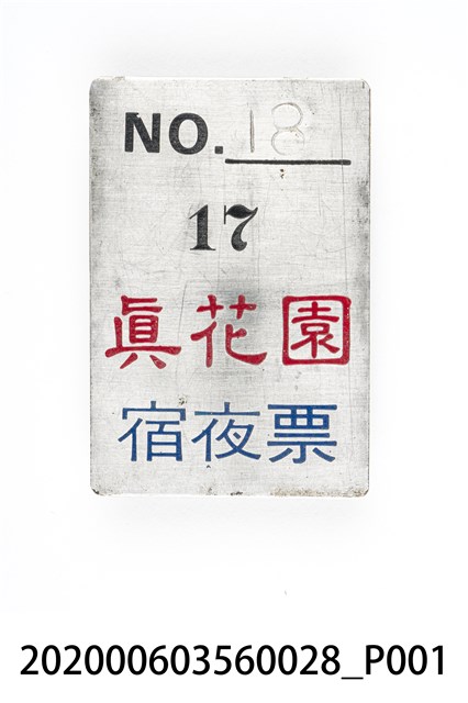 1.本物件為真花園宿夜票與時間票,為鐵製品,分為兩種,橘色字體的為時間票,藍色字體的為宿業票,兩者上面皆有號碼以及寫上「真花園」,旁邊有1個白色塑膠長方盒,可以將票券收納於此,整個物件保存完整。 2. 1907年日本頒布法令,准許台灣人開設妓院,1922年(大正11年)臺南州政府將臺南市內的貸座敷(妓院)集中在新町以便於管理和整頓風紀,1930年代,府城人戲稱『第一賣冰,第二醫生,第三新町,第四跤筲間』,足以印證特種行業極盛的曾經,隨著日本的戰敗,台灣經營者面臨政府1946年的廢除公娼、肅娼而難以為繼,最終僅存的日治時期享有盛名的妓女戶之二:新松金樓,已於2005年已經拆除;真花園(臺南市康樂街19號),1座完整的四合院建築,屋主在無力維修的情況下,於2009年05月20日拆下招牌,這也代表真花園是最後一間見證新町歷史的有牌妓女戶,走入歷史。