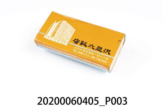 1.餐廳、飯店為主等廣告的火柴盒,可以說是早期瓦斯爐尚不盛行,又可達到廣告宣傳的小小載體。而火柴盒上通常有商家中英文名稱、商標或電話,偶有營業品項或設備,如桃花鄉酒家有電話與強調有冷暖設備、春成八卦窯則強調自家為「專製紅磚」、百利餐廳宣傳自家為法式西餐、飲料名酒、喜慶宴席、正宗中菜等。 2.臺灣在打火機與瓦斯爐普及前,火柴是臺灣重要的民生物資,因此火柴生產也行程專門產業,商家透過印製宣傳火柴盒作為贈品,用以販售或免費宣傳發送,盒面商標各具特色,例如臺灣火柴公司發行的「自由之火」火柴盒正面使用熊熊火把作為商標。而本件文物則有各家飯店的名稱,如圓山大飯店、希爾頓大飯店、六福客棧等,皆是現今仍持續營業的商家。