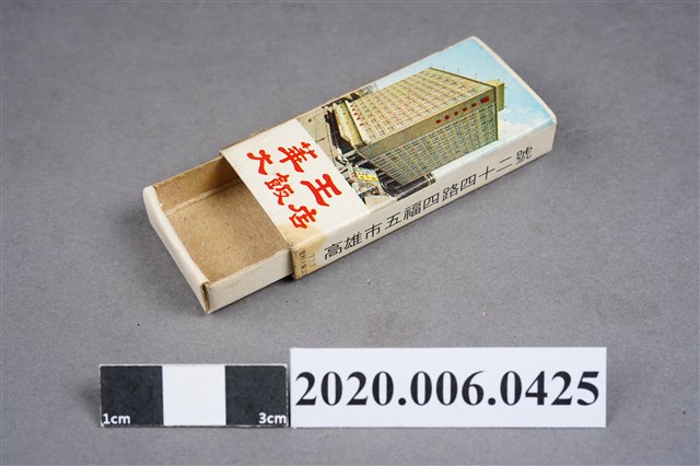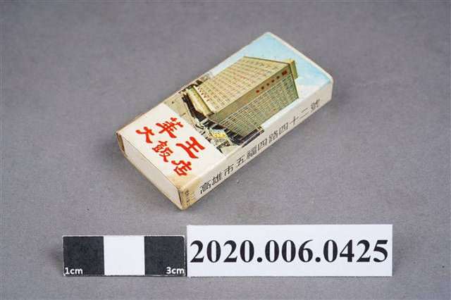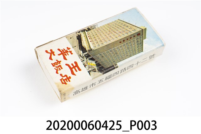 2.臺灣在打火機與瓦斯爐普及前,火柴是臺灣重要的民生物資,因此火柴生產也行程專門產業,商家透過印製宣傳火柴盒作為贈品,用以販售或免費宣傳發送,盒面商標各具特色,例如臺灣火柴公司發行的「自由之火」火柴盒正面使用熊熊火把作為商標。而本件文物則有各家飯店的名稱,如圓山大飯店、希爾頓大飯店、六福客棧等,皆是現今仍持續營業的商家。