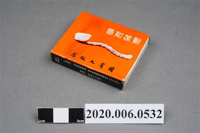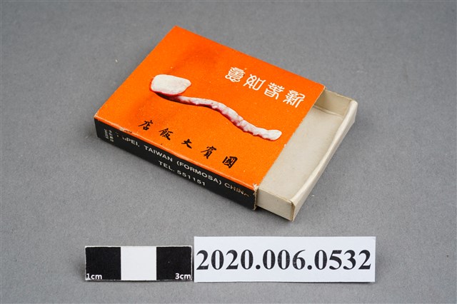 1.餐廳、飯店為主等廣告的火柴盒,可以說是早期瓦斯爐尚不盛行,又可達到廣告宣傳的小小載體。而火柴盒上通常有商家中英文名稱、商標或電話,偶有營業品項或設備,如桃花鄉酒家有電話與強調有冷暖設備、春成八卦窯則強調自家為「專製紅磚」、百利餐廳宣傳自家為法式西餐、飲料名酒、喜慶宴席、正宗中菜等。 2.臺灣在打火機與瓦斯爐普及前,火柴是臺灣重要的民生物資,因此火柴生產也行程專門產業,商家透過印製宣傳火柴盒作為贈品,用以販售或免費宣傳發送,盒面商標各具特色,例如臺灣火柴公司發行的「自由之火」火柴盒正面使用熊熊火把作為商標。而本件文物則有各家飯店的名稱,如圓山大飯店、希爾頓大飯店、六福客棧等,皆是現今仍持續營業的商家。