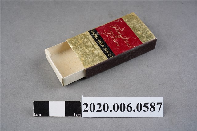 2.臺灣在打火機與瓦斯爐普及前,火柴是臺灣重要的民生物資,因此火柴生產也行程專門產業,商家透過印製宣傳火柴盒作為贈品,用以販售或免費宣傳發送,盒面商標各具特色,例如臺灣火柴公司發行的「自由之火」火柴盒正面使用熊熊火把作為商標。而本件文物則有各家飯店的名稱,有些火柴盒側邊會有廣告公司與或火柴製造商,如有國榮廣告火柴公司承製、地址為新竹市中正路18號(火車站前)、電話則有各地專線(新竹、臺北、高雄)。也隨著火柴廣告公司的出現,火柴盒的廣告呈現方式也有所不同,如部份有明的商家則簡單陳述「臺北‧華西街 台南担仔麵」名稱。
