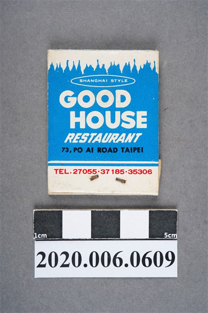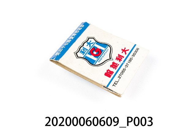 1.餐廳、飯店為主等廣告的火柴盒,可以說是早期瓦斯爐尚不盛行,又可達到廣告宣傳的小小載體。火柴盒的外觀也不限於僅有四角形,開始出現六角形或長方形盒裝,也有外觀如小屋子的造型。 2.臺灣在打火機與瓦斯爐普及前,火柴是臺灣重要的民生物資,因此火柴生產也行程專門產業,商家透過印製宣傳火柴盒作為贈品,用以販售或免費宣傳發送,盒面商標各具特色,例如臺灣火柴公司發行的「自由之火」火柴盒正面使用熊熊火把作為商標。而本件文物則有各家飯店的名稱,有些火柴盒側邊會有廣告公司與或火柴製造商,如有國榮廣告火柴公司承製、地址為新竹市中正路18號(火車站前)、電話則有各地專線(新竹、臺北、高雄)。也隨著火柴廣告公司的出現,火柴盒的廣告呈現方式也有所不同,如部份有明的商家則簡單陳述「臺北‧華西街 台南担仔麵」名稱。
