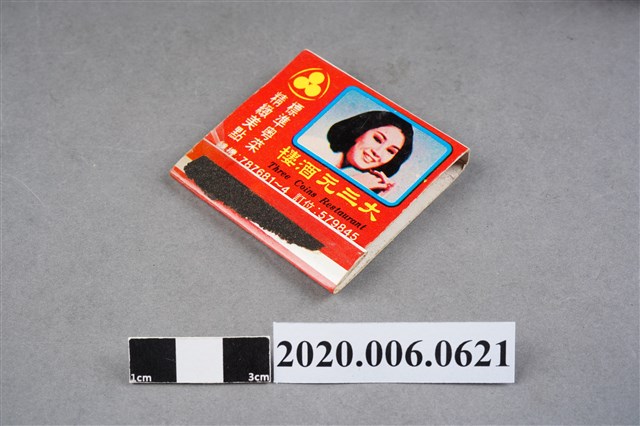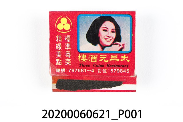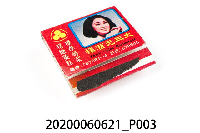 1.餐廳、飯店為主等廣告的火柴盒,可以說是早期瓦斯爐尚不盛行,又可達到廣告宣傳的小小載體。火柴盒的外觀也不限於僅有四角形,開始出現六角形或長方形盒裝,也有外觀如小屋子的造型。 2.臺灣在打火機與瓦斯爐普及前,火柴是臺灣重要的民生物資,因此火柴生產也行程專門產業,商家透過印製宣傳火柴盒作為贈品,用以販售或免費宣傳發送,盒面商標各具特色,例如臺灣火柴公司發行的「自由之火」火柴盒正面使用熊熊火把作為商標。而本件文物則有各家飯店的名稱,有些火柴盒側邊會有廣告公司與或火柴製造商,如有國榮廣告火柴公司承製、地址為新竹市中正路18號(火車站前)、電話則有各地專線(新竹、臺北、高雄)。也隨著火柴廣告公司的出現,火柴盒的廣告呈現方式也有所不同,如部份有明的商家則簡單陳述「臺北‧華西街 台南担仔麵」名稱。