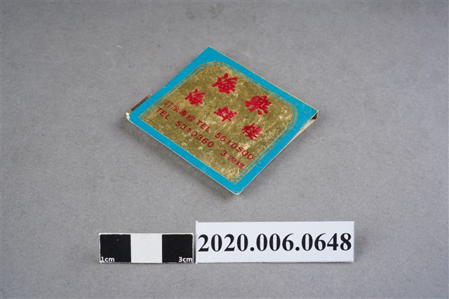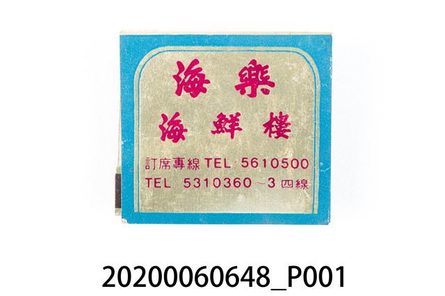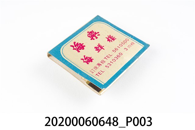 1.餐廳、飯店為主等廣告的火柴盒,可以說是早期瓦斯爐尚不盛行,又可達到廣告宣傳的小小載體。火柴盒的外觀也不限於僅有四角形,開始出現六角形或長方形盒裝,也有外觀如小屋子的造型。 2.臺灣在打火機與瓦斯爐普及前,火柴是臺灣重要的民生物資,因此火柴生產也行程專門產業,商家透過印製宣傳火柴盒作為贈品,用以販售或免費宣傳發送,盒面商標各具特色,例如臺灣火柴公司發行的「自由之火」火柴盒正面使用熊熊火把作為商標。而本件文物則有各家飯店的名稱,有些火柴盒側邊會有廣告公司與或火柴製造商,如有國榮廣告火柴公司承製、地址為新竹市中正路18號(火車站前)、電話則有各地專線(新竹、臺北、高雄)。也隨著火柴廣告公司的出現,火柴盒的廣告呈現方式也有所不同,如部份有明的商家則簡單陳述「臺北‧華西街 台南担仔麵」名稱。