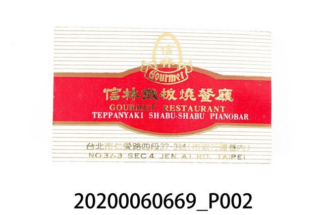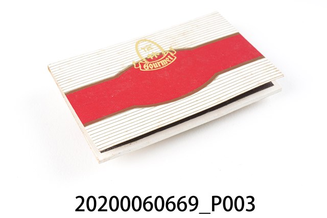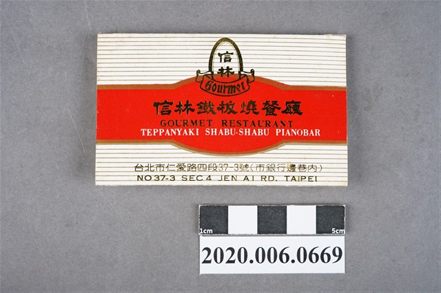 1.餐廳、飯店為主等廣告的火柴盒,可以說是早期瓦斯爐尚不盛行,又可達到廣告宣傳的小小載體。火柴盒的外觀也不限於僅有四角形,開始出現六角形或長方形盒裝,也有外觀如小屋子的造型。 2.臺灣在打火機與瓦斯爐普及前,火柴是臺灣重要的民生物資,因此火柴生產也行程專門產業,商家透過印製宣傳火柴盒作為贈品,用以販售或免費宣傳發送,盒面商標各具特色,例如臺灣火柴公司發行的「自由之火」火柴盒正面使用熊熊火把作為商標。而本件文物則有各家飯店的名稱,有些火柴盒側邊會有廣告公司與或火柴製造商,如有國榮廣告火柴公司承製、地址為新竹市中正路18號(火車站前)、電話則有各地專線(新竹、臺北、高雄)。也隨著火柴廣告公司的出現,火柴盒的廣告呈現方式也有所不同,如部份有明的商家則簡單陳述「臺北‧華西街 台南担仔麵」名稱。