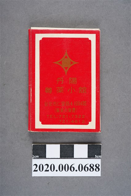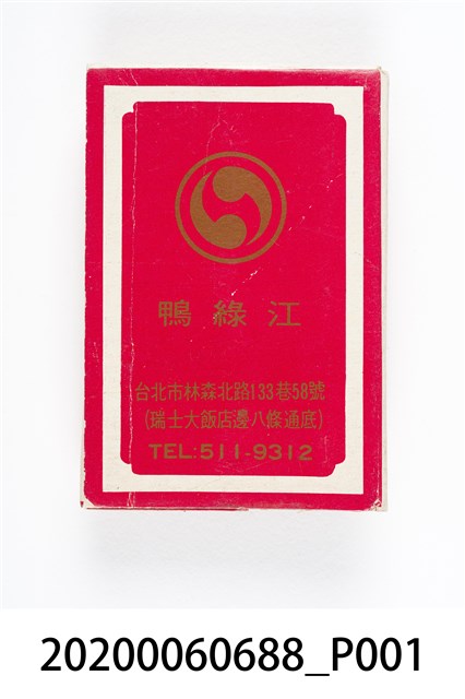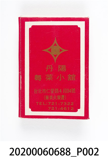1.餐廳、飯店為主等廣告的火柴盒,可以說是早期瓦斯爐尚不盛行,又可達到廣告宣傳的小小載體。火柴盒的外觀也不限於僅有四角形,開始出現六角形或長方形盒裝,也有外觀如小屋子的造型。 2.臺灣在打火機與瓦斯爐普及前,火柴是臺灣重要的民生物資,因此火柴生產也行程專門產業,商家透過印製宣傳火柴盒作為贈品,用以販售或免費宣傳發送,盒面商標各具特色,例如臺灣火柴公司發行的「自由之火」火柴盒正面使用熊熊火把作為商標。而本件文物則有各家飯店的名稱,有些火柴盒側邊會有廣告公司與或火柴製造商,如有國榮廣告火柴公司承製、地址為新竹市中正路18號(火車站前)、電話則有各地專線(新竹、臺北、高雄)。也隨著火柴廣告公司的出現,火柴盒的廣告呈現方式也有所不同,如部份有明的商家則簡單陳述「臺北‧華西街 台南担仔麵」名稱。