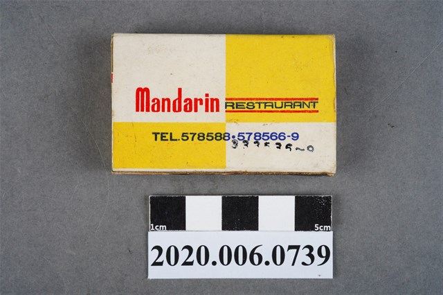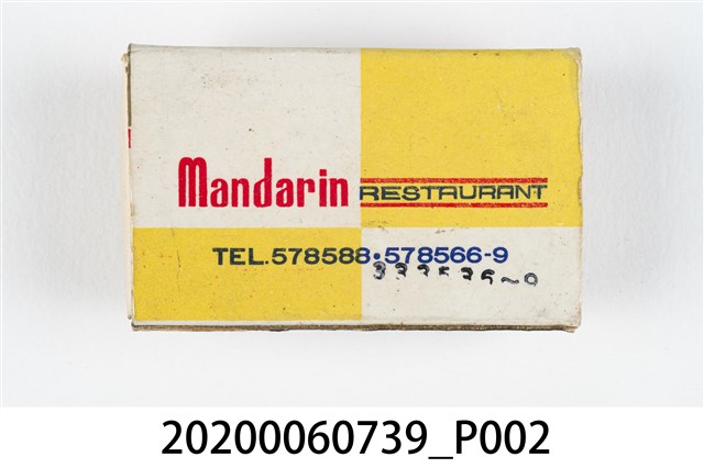 1.內容主要以餐廳、菜館、音響廳、歌廳、夜總會與俱樂部為主的廣告火柴盒。本件文物則有餐廳、店家、歌廳或酒家的名稱。有些火柴盒側邊會有廣告公司與或火柴製造商,如有國榮廣告火柴公司承製、地址為新竹市中正路18號(火車站前)、電話則有各地專線(新竹、臺北、高雄)。也隨著火柴廣告公司的出現,火柴盒的廣告呈現方式也有所不同,類似現今商標LOGO的呈現方式。本件文物的各式餐廳,可以發現類型豐富,包含中式料理、西式料理、越南料理、粵菜料理、日式料理、蒙古烤肉、咖啡店、海產料理。且類型也相當多元,正規西餐廳、一般餐廳、飯店、俱樂部、歌廳、酒家等皆透過火柴盒廣告與宣傳。2.臺灣在打火機與瓦斯爐普及前,火柴是臺灣重要的民生物資,因此火柴生產也行程專門產業,商家透過印製宣傳火柴盒作為贈品,用以販售或免費宣傳發送,盒面商標各具特色,例如臺灣火柴公司發行的「自由之火」火柴盒正面使用熊熊火把作為商標。