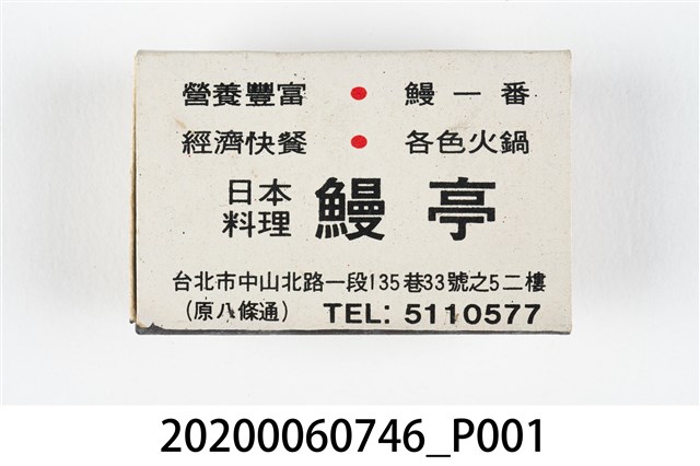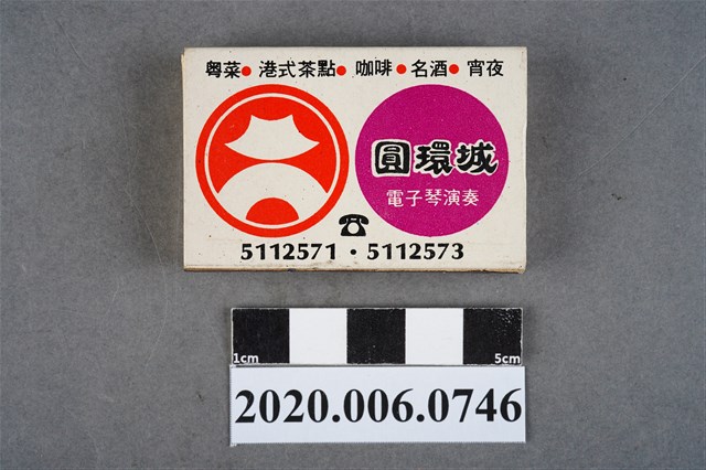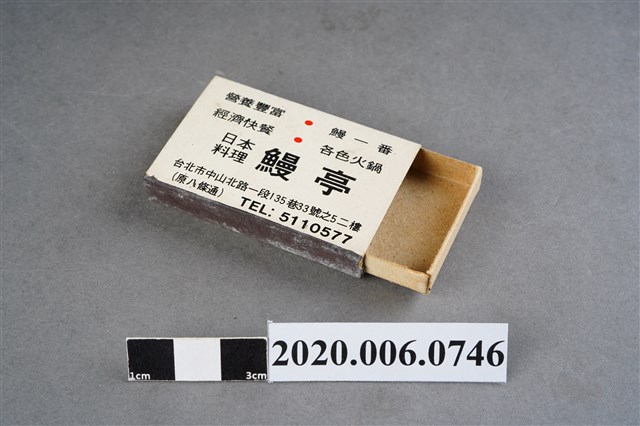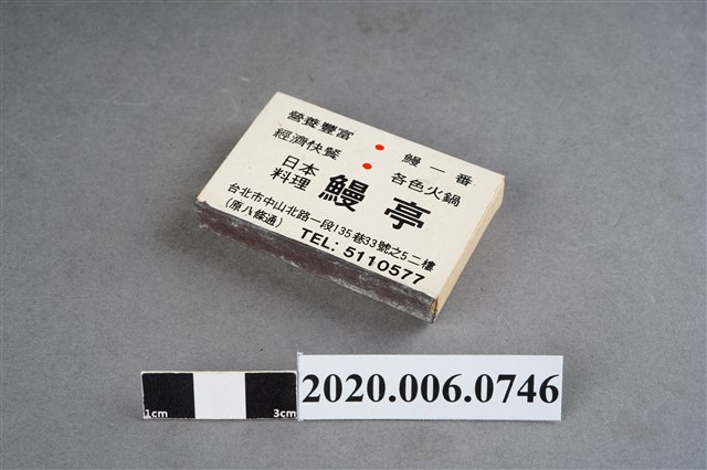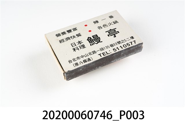 1.內容主要以餐廳、菜館、音響廳、歌廳、夜總會與俱樂部為主的廣告火柴盒。本件文物則有餐廳、店家、歌廳或酒家的名稱。有些火柴盒側邊會有廣告公司與或火柴製造商,如有國榮廣告火柴公司承製、地址為新竹市中正路18號(火車站前)、電話則有各地專線(新竹、臺北、高雄)。也隨著火柴廣告公司的出現,火柴盒的廣告呈現方式也有所不同,類似現今商標LOGO的呈現方式。本件文物的各式餐廳,可以發現類型豐富,包含中式料理、西式料理、越南料理、粵菜料理、日式料理、蒙古烤肉、咖啡店、海產料理。且類型也相當多元,正規西餐廳、一般餐廳、飯店、俱樂部、歌廳、酒家等皆透過火柴盒廣告與宣傳。2.臺灣在打火機與瓦斯爐普及前,火柴是臺灣重要的民生物資,因此火柴生產也行程專門產業,商家透過印製宣傳火柴盒作為贈品,用以販售或免費宣傳發送,盒面商標各具特色,例如臺灣火柴公司發行的「自由之火」火柴盒正面使用熊熊火把作為商標。