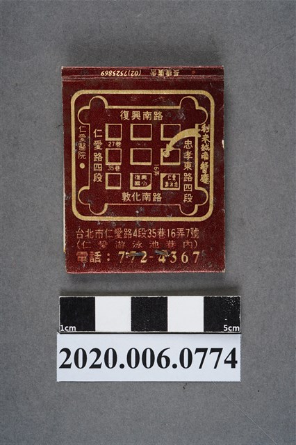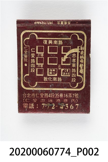 1.內容主要以餐廳、菜館、音響廳、歌廳、夜總會與俱樂部為主的廣告火柴盒。本件文物則有餐廳、店家、歌廳或酒家的名稱。有些火柴盒側邊會有廣告公司與或火柴製造商,如有國榮廣告火柴公司承製、地址為新竹市中正路18號(火車站前)、電話則有各地專線(新竹、臺北、高雄)。也隨著火柴廣告公司的出現,火柴盒的廣告呈現方式也有所不同,類似現今商標LOGO的呈現方式。本件文物的各式餐廳,可以發現類型豐富,包含中式料理、西式料理、越南料理、粵菜料理、日式料理、蒙古烤肉、咖啡店、海產料理。且類型也相當多元,正規西餐廳、一般餐廳、飯店、俱樂部、歌廳、酒家等皆透過火柴盒廣告與宣傳。