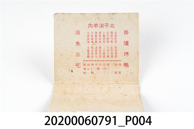 1.內容主要以餐廳、菜館、音響廳、歌廳、夜總會與俱樂部為主的廣告火柴盒。本件文物則有餐廳、店家、歌廳或酒家的名稱。有些火柴盒側邊會有廣告公司與或火柴製造商,如有國榮廣告火柴公司承製、地址為新竹市中正路18號(火車站前)、電話則有各地專線(新竹、臺北、高雄)。也隨著火柴廣告公司的出現,火柴盒的廣告呈現方式也有所不同,類似現今商標LOGO的呈現方式。本件文物的各式餐廳,可以發現類型豐富,包含中式料理、西式料理、越南料理、粵菜料理、日式料理、蒙古烤肉、咖啡店、海產料理。且類型也相當多元,正規西餐廳、一般餐廳、飯店、俱樂部、歌廳、酒家等皆透過火柴盒廣告與宣傳。2.臺灣在打火機與瓦斯爐普及前,火柴是臺灣重要的民生物資,因此火柴生產也行程專門產業,商家透過印製宣傳火柴盒作為贈品,用以販售或免費宣傳發送,盒面商標各具特色,例如臺灣火柴公司發行的「自由之火」火柴盒正面使用熊熊火把作為商標。