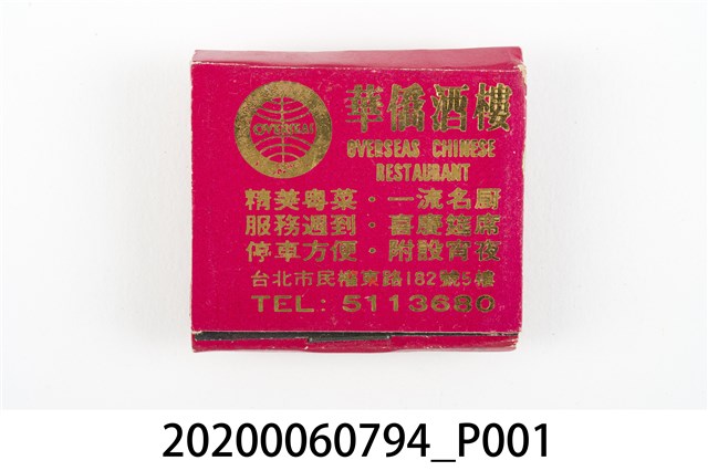 1.內容主要以餐廳、菜館、音響廳、歌廳、夜總會與俱樂部為主的廣告火柴盒。本件文物則有餐廳、店家、歌廳或酒家的名稱。有些火柴盒側邊會有廣告公司與或火柴製造商,如有國榮廣告火柴公司承製、地址為新竹市中正路18號(火車站前)、電話則有各地專線(新竹、臺北、高雄)。也隨著火柴廣告公司的出現,火柴盒的廣告呈現方式也有所不同,類似現今商標LOGO的呈現方式。本件文物的各式餐廳,可以發現類型豐富,包含中式料理、西式料理、越南料理、粵菜料理、日式料理、蒙古烤肉、咖啡店、海產料理。且類型也相當多元,正規西餐廳、一般餐廳、飯店、俱樂部、歌廳、酒家等皆透過火柴盒廣告與宣傳。2.臺灣在打火機與瓦斯爐普及前,火柴是臺灣重要的民生物資,因此火柴生產也行程專門產業,商家透過印製宣傳火柴盒作為贈品,用以販售或免費宣傳發送,盒面商標各具特色,例如臺灣火柴公司發行的「自由之火」火柴盒正面使用熊熊火把作為商標。