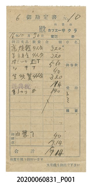 1.本物件為咖啡店收據,收據上寫有品項、單價及總金額,最後並有餐廳名稱、住址與電話。 2.在早期酒家是個非常高檔的娛樂場所,藝旦原則上是賣藝不賣身,出入分子多為政要、鉅商、墨客騷人,林獻堂、蔣渭水、梁啟超、後藤新平都曾是酒家的座上賓,當時的酒家類似17、18世紀歐洲的沙龍,日治時期,臺灣人所謂的酒家以「蓬萊閣」、「東薈芳」、「江山樓」和「春風得意樓」等最為著名,然並不僅止於喫花酒的層次而已,最重要的歷史事件之一是蔣渭水為首的臺灣工友聯盟在1928年蓬萊閣舉行成立大會,會後合照,留下了背景在蓬萊閣樓門柱上垂掛「同胞需團結,團結真有力」的長幅布條。