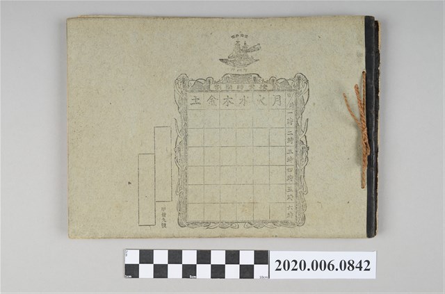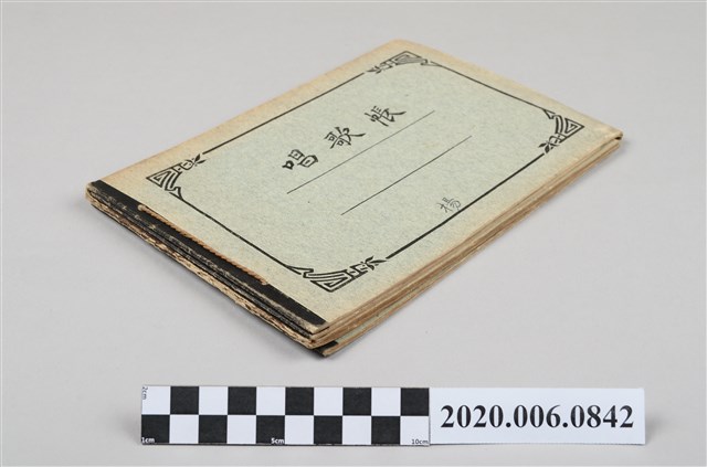 1.本物件為《唱歌帳》,為橫式,為灰色封面,上面畫有1黑色方框,裡面則寫有唱歌帳,最下方還有1手寫「楊」字。