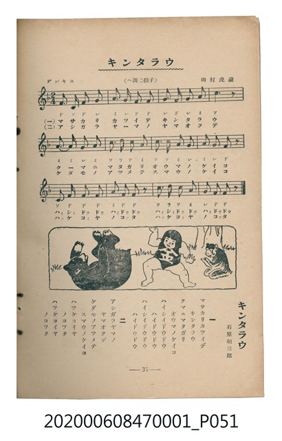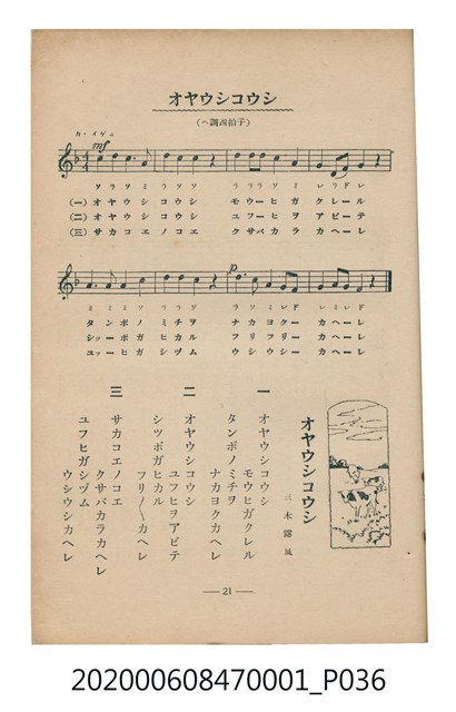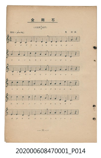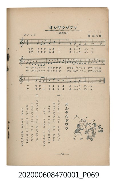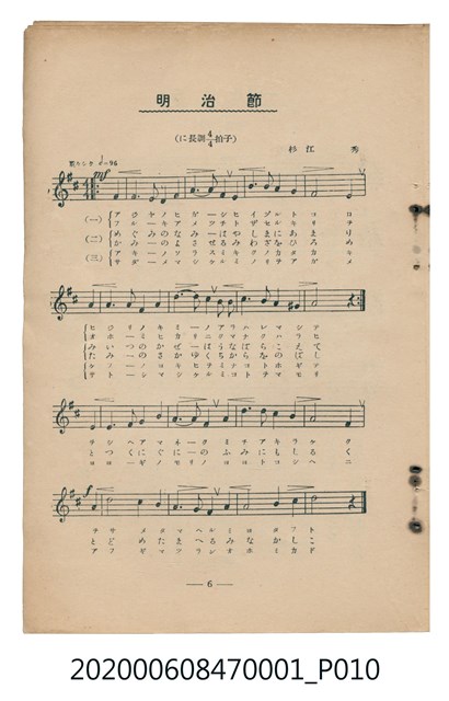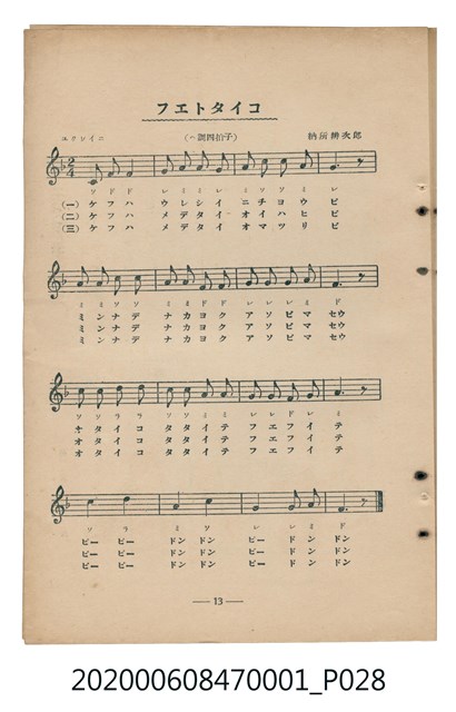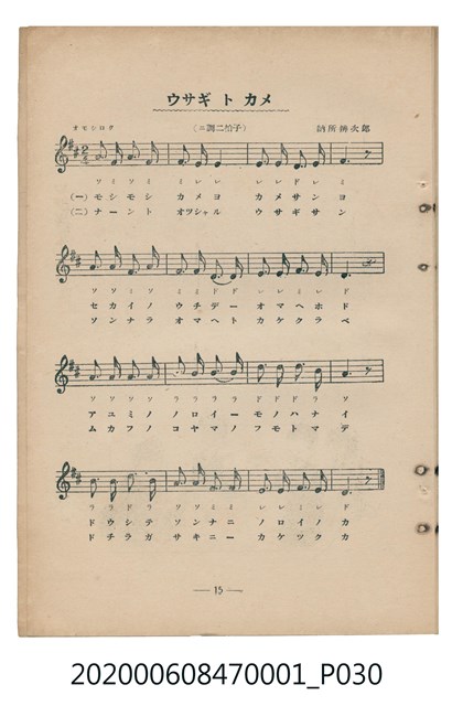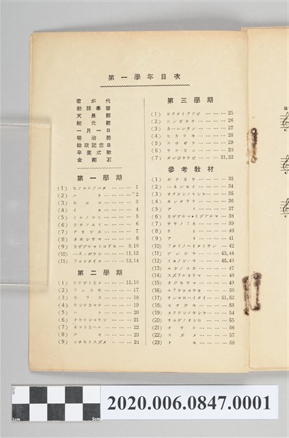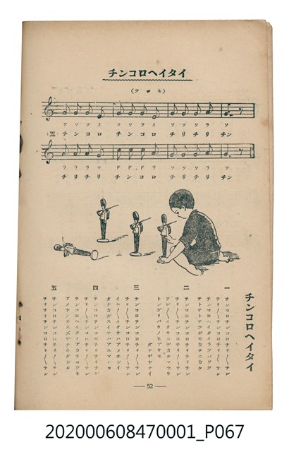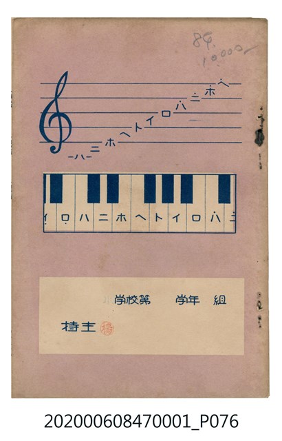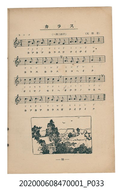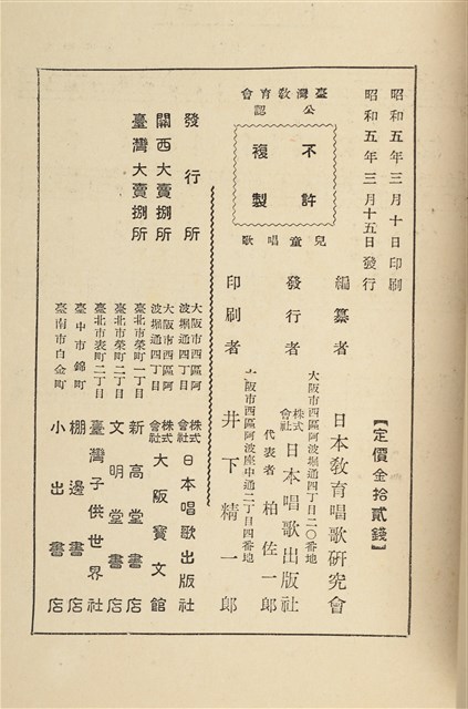 1.本物件為臺灣教育會公認日本教育唱歌研究會編纂《新定兒童唱歌》,封面最上方皆寫有「臺灣教育會公認日本教育唱歌研究會編」字樣,中間則寫上「新訂兒童唱歌」,每本的封面圖案皆不盡相同,下方則寫有適用對象的年齡,從尋常科第二學年到高等科男子一二年都有,所有物件保存皆算完整,僅在裝訂處有些許生鏽痕跡。