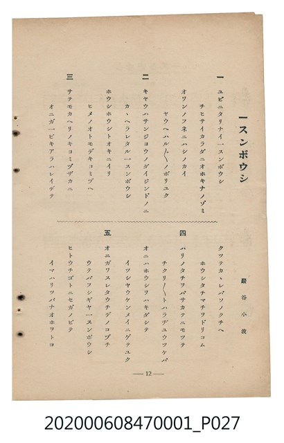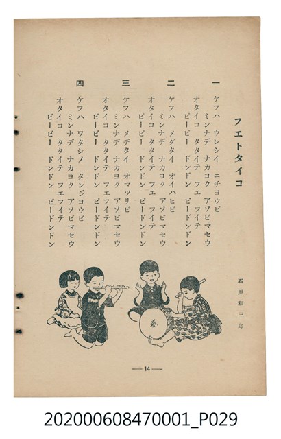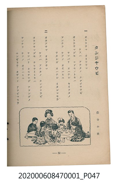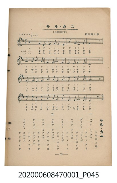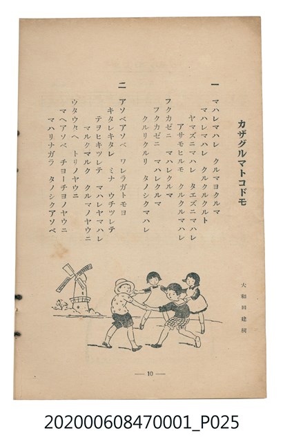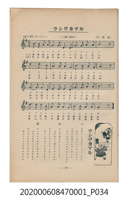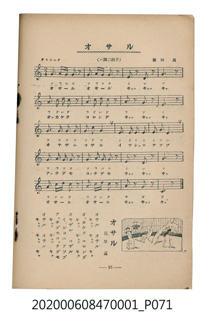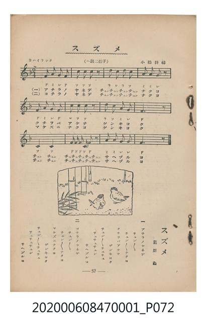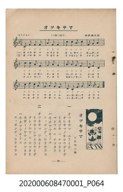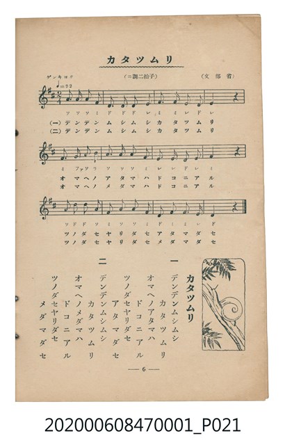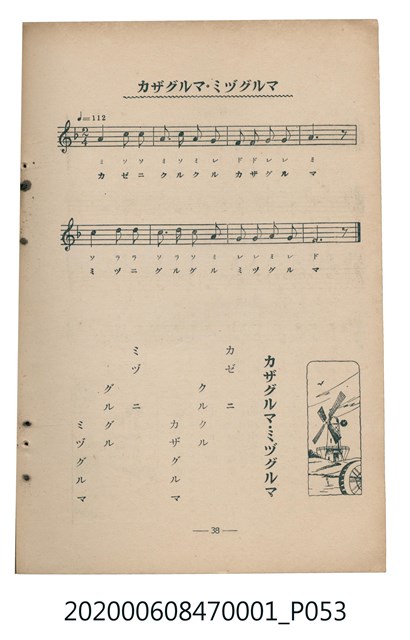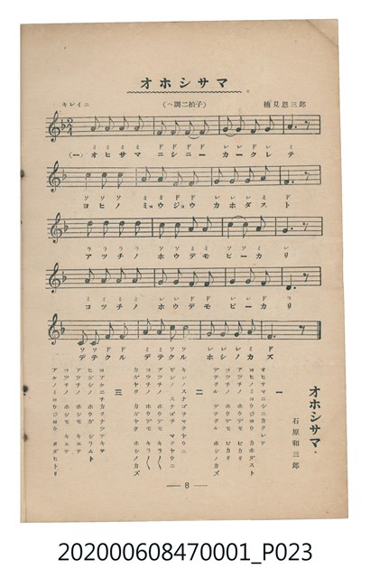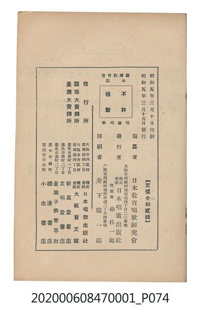 1.本物件為臺灣教育會公認日本教育唱歌研究會編纂《新定兒童唱歌》,封面最上方皆寫有「臺灣教育會公認日本教育唱歌研究會編」字樣,中間則寫上「新訂兒童唱歌」,每本的封面圖案皆不盡相同,下方則寫有適用對象的年齡,從尋常科第二學年到高等科男子一二年都有,所有物件保存皆算完整,僅在裝訂處有些許生鏽痕跡。