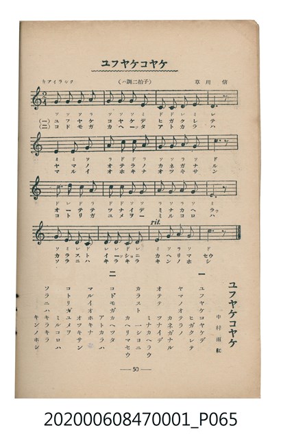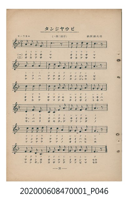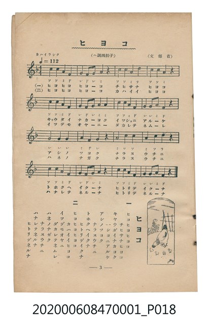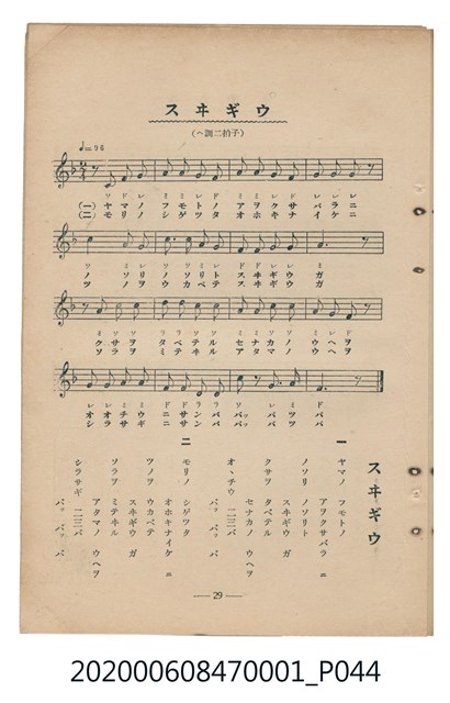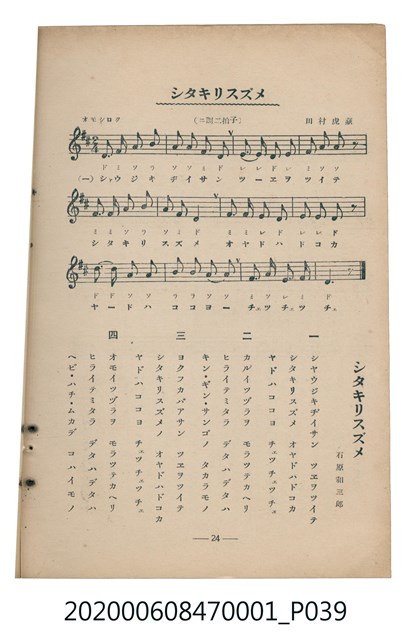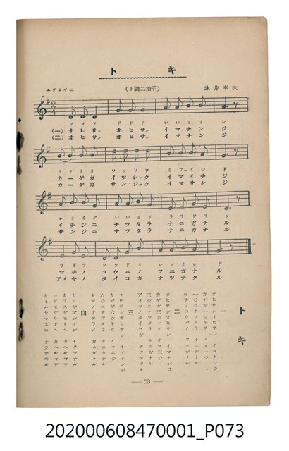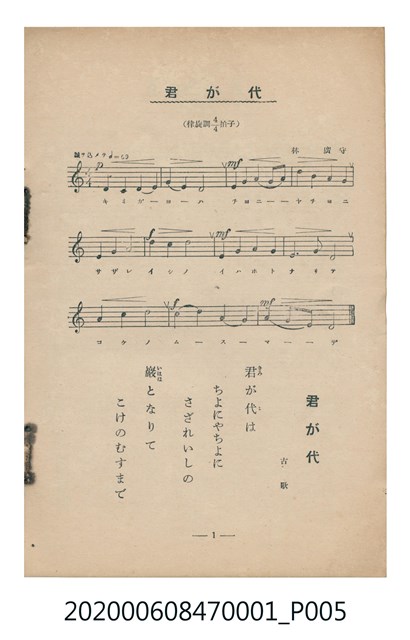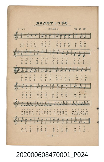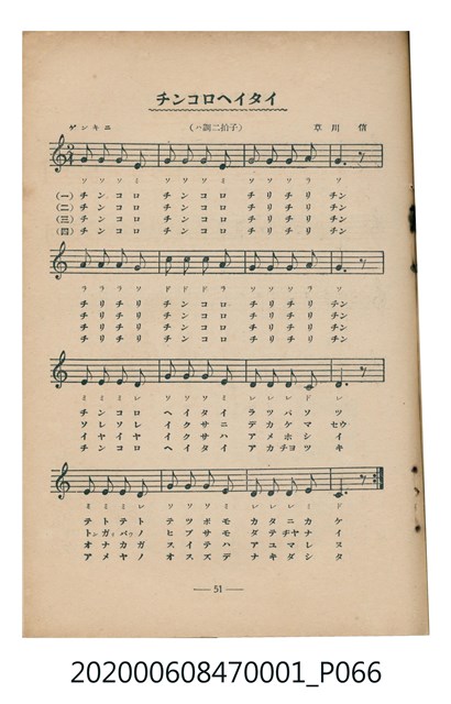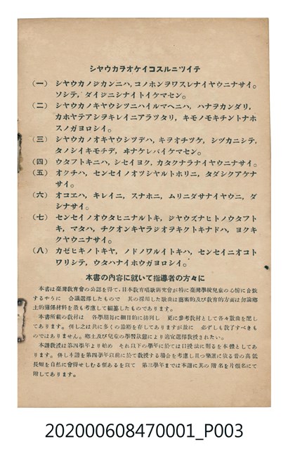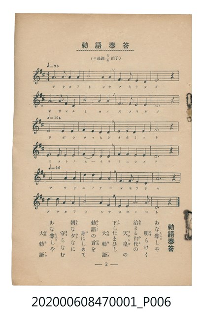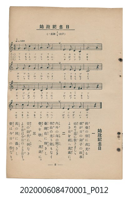2.日治初期,臺灣總督府便在臺實施音樂教育,具有作為輔助「國語」(日本語)教學和涵養臺灣人德性之功用,臺灣總督府在臺實施的唱歌教育和國語教育,可說是幾乎和日本本國同步實施,另一方面,為教化臺人領略皇國精神,在學校教育中推動的唱歌教育便擔負增進兒童在品德、美感和「國語」(日本語)教育等方面的功能。