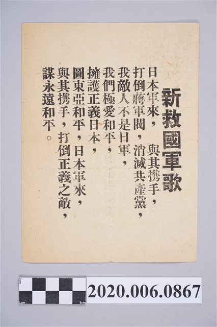 2020.006.0867 〈新救國軍歌〉日軍宣傳單