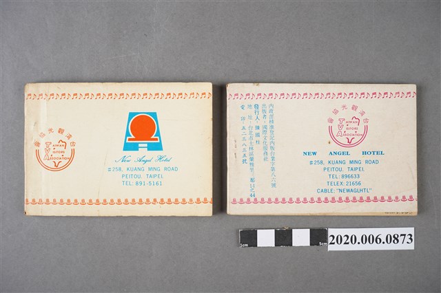 1.本物件為熱海飯店中日民謠歌謠集,一共有2本,藍白交錯與紅白交錯的封面印有熱海飯店照片,下方則印有住址「臺北市北投區光明路258號」以及電話號碼,封面上還寫有「中日民謠歌集」字樣,歌本背面則印有「臺灣觀光協會」印戳及飯店英文版資料,歌本內印有「中國民謠集」」目錄,整個物件因收藏關係,有些許斑駁與褪色。