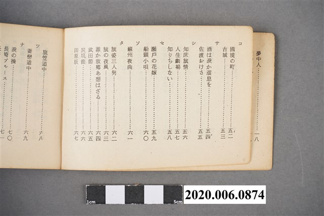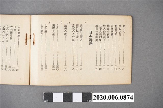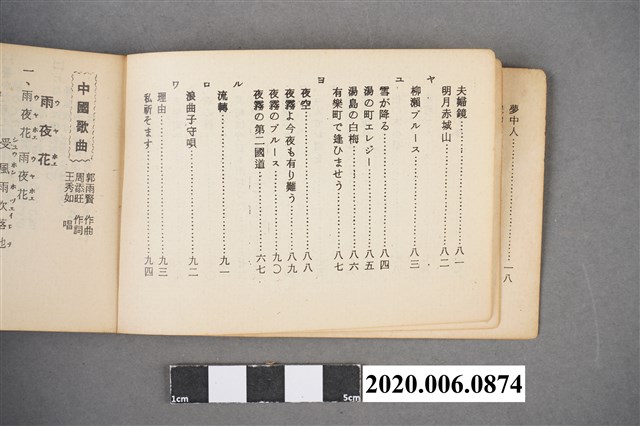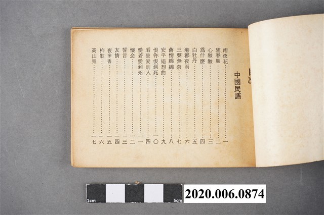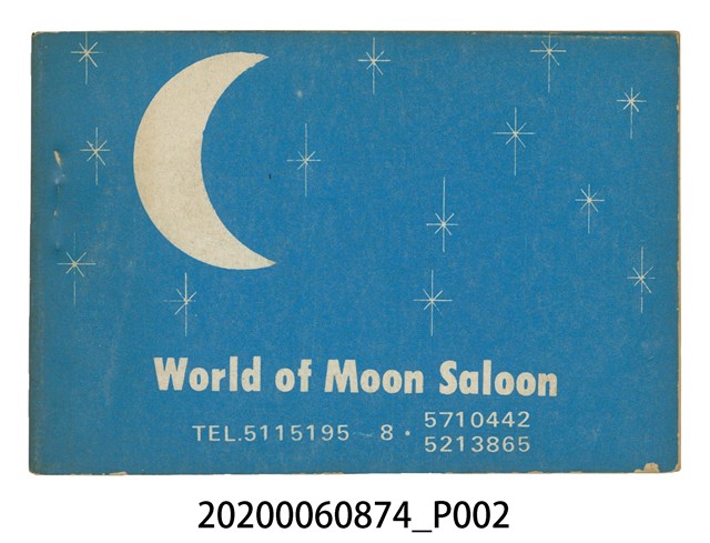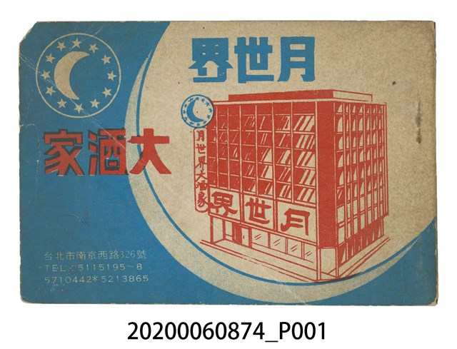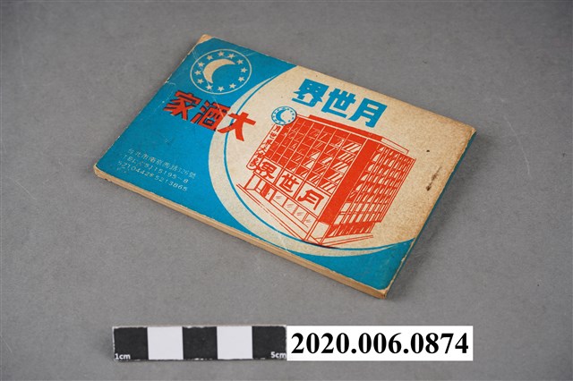1.本物件為月世界大酒家歌本,藍白交錯的封面紅色月世界酒家外觀,下方則印有住址「臺北市南京西路326號」以及電話號碼,封面上還寫有「月世界大酒家」字樣及商標,歌本背面則印有酒家英文版資料,歌本內印有「中國民謠集」」目錄,整個物件因收藏關係,有些許斑駁與褪色。