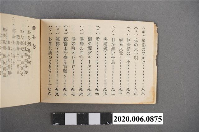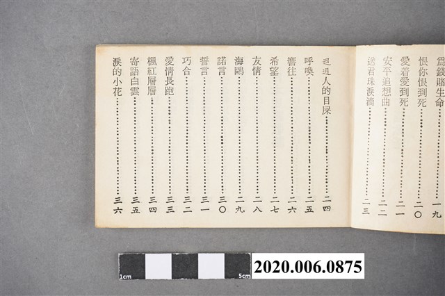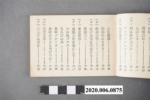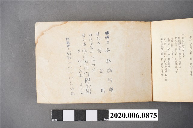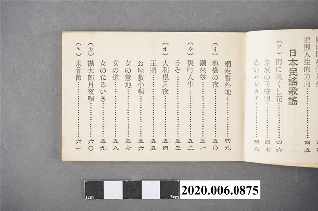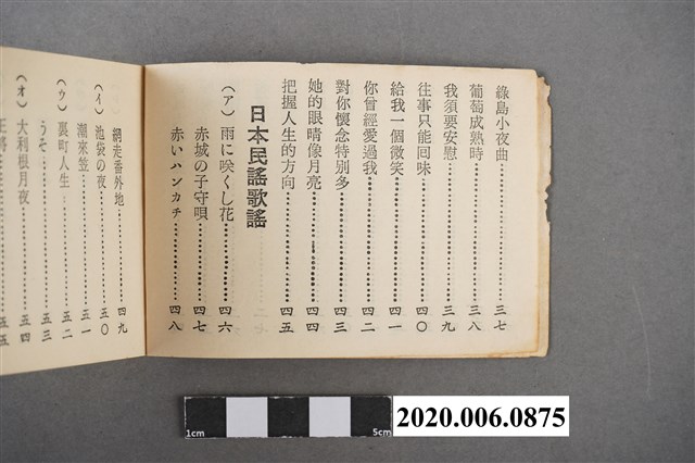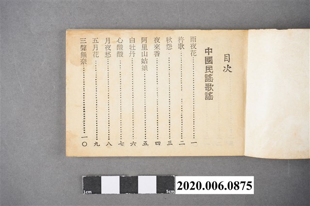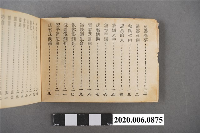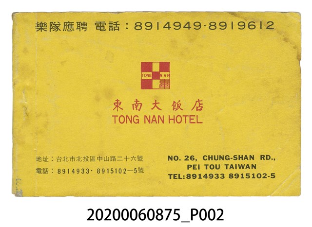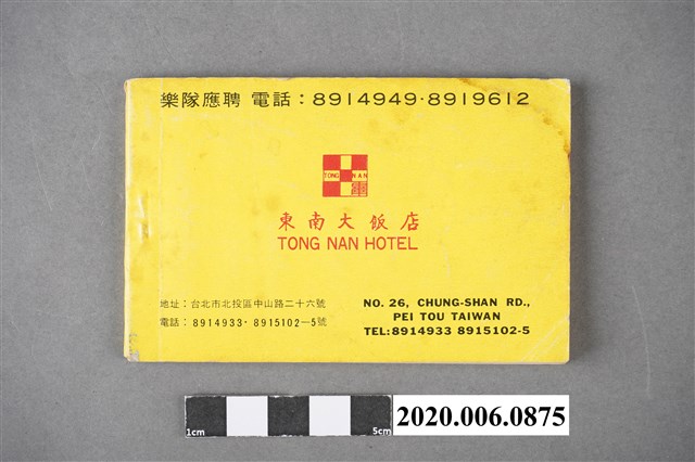 1.本物件為東南大飯店歌本,封面上印有東南大飯店照片,背面則印有住址「臺北市北投區中山路26號」及電話號碼,還寫有「東南大飯店」、商標與「樂隊應聘」字樣,還有飯店英文版資料,歌本內印有「中國民謠歌謠」」目錄,整個物件因收藏關係,有些許斑駁與褪色。