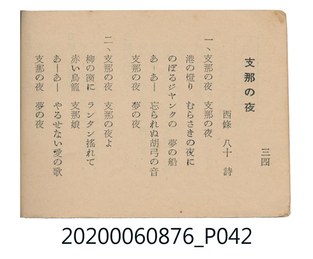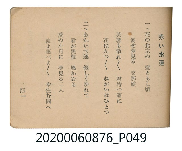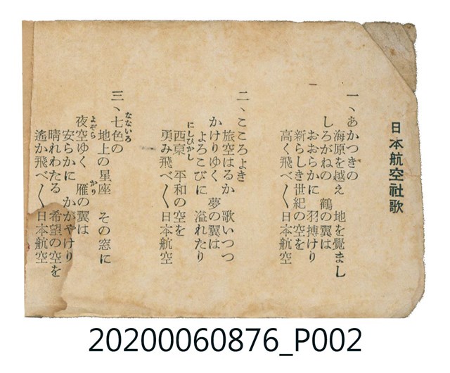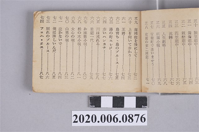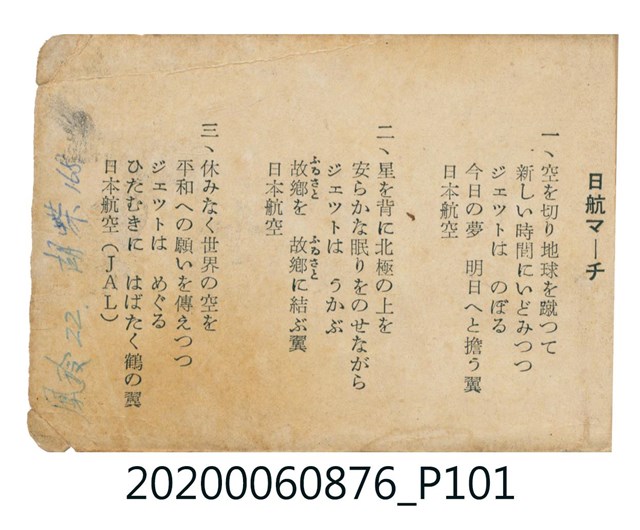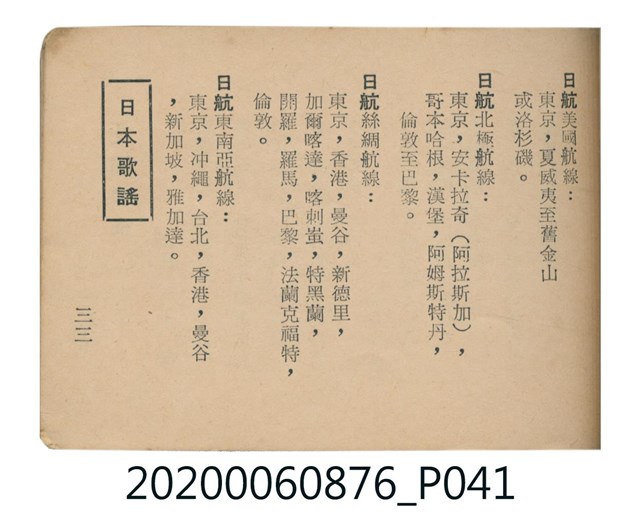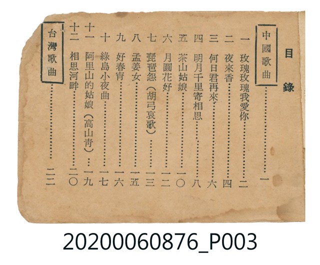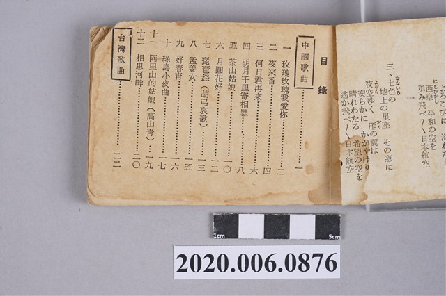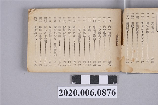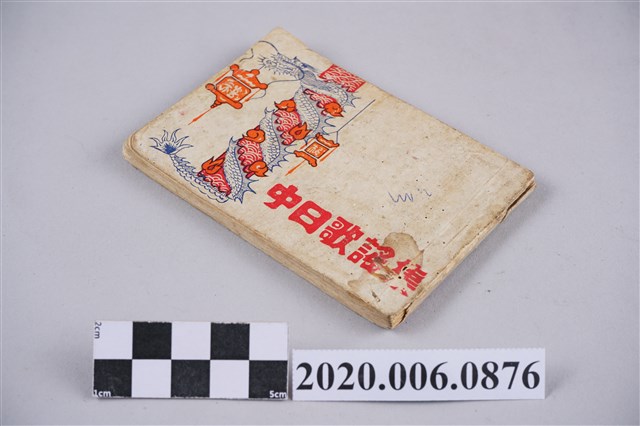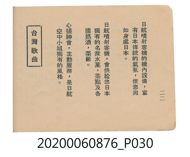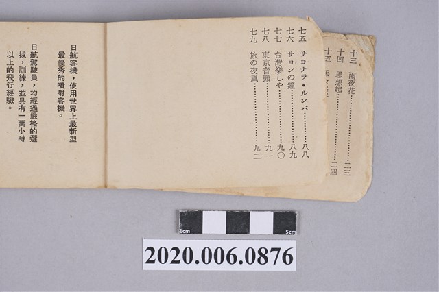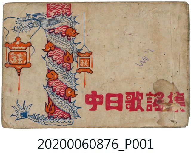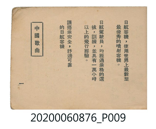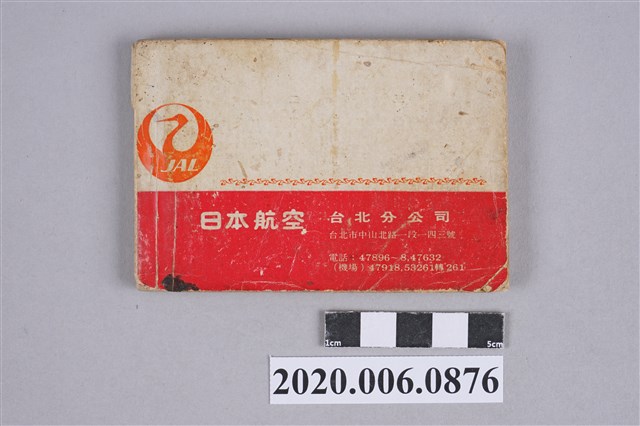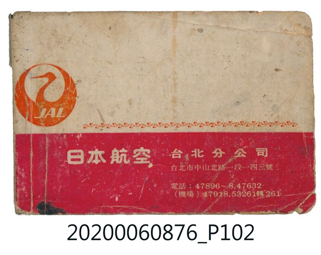 1.本物件為日本航空中日歌謠集,封面上印有中國龍柱與2盞燈籠,上面並寫有「中日歌謠集」,背面則印有日本航空公司台北分公司的住址「臺北市中山北路一段143號」及電話號碼,還有商標,整個物件因收藏關係,有些許斑駁與褪色。