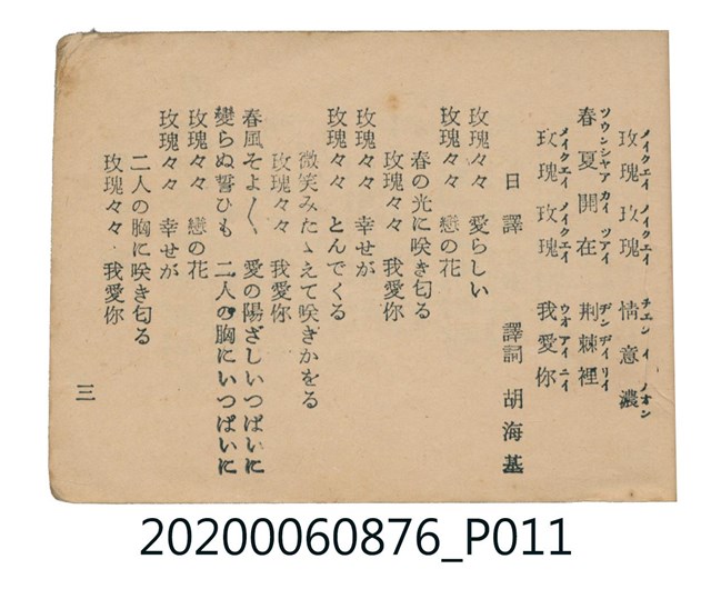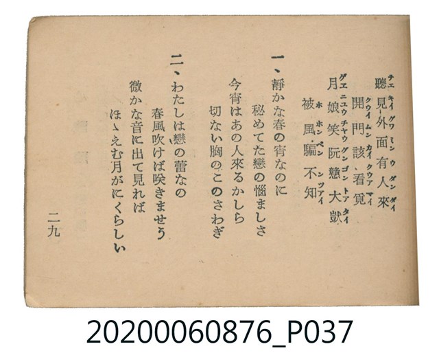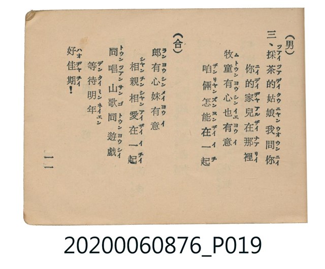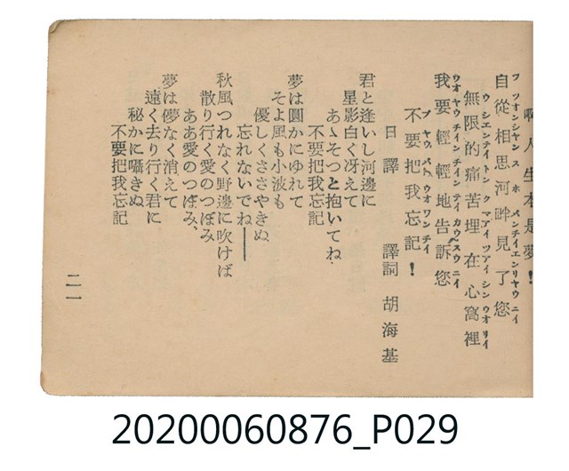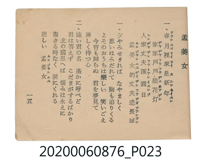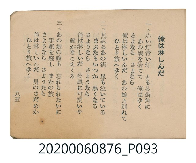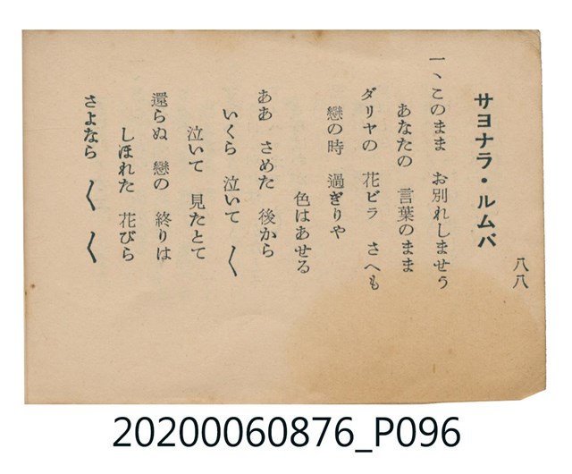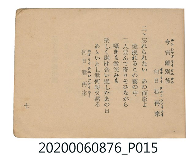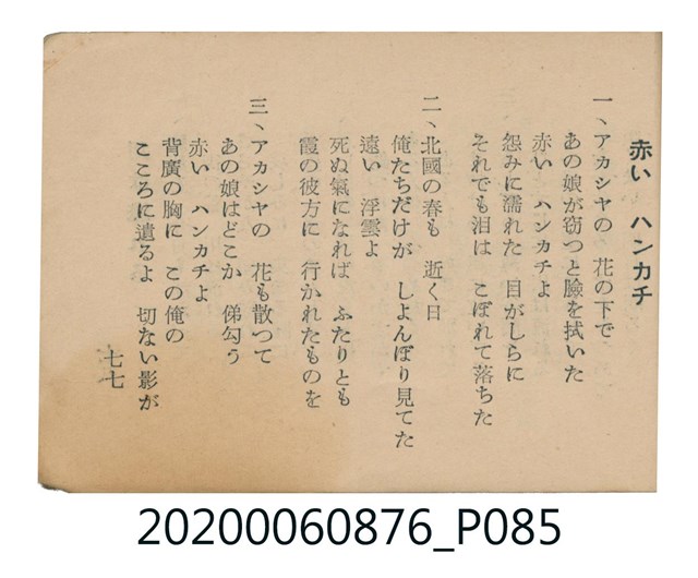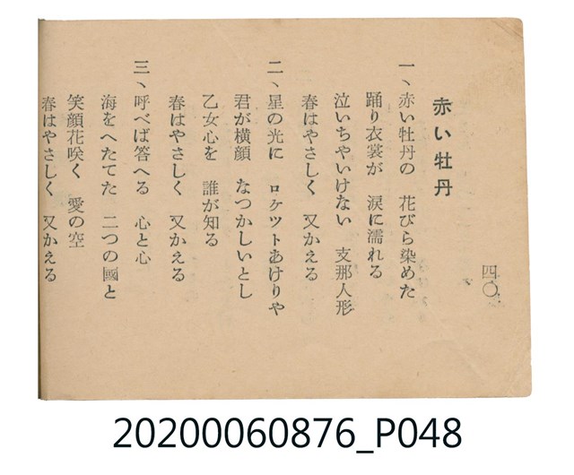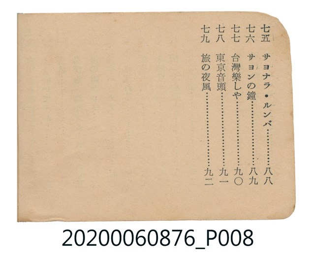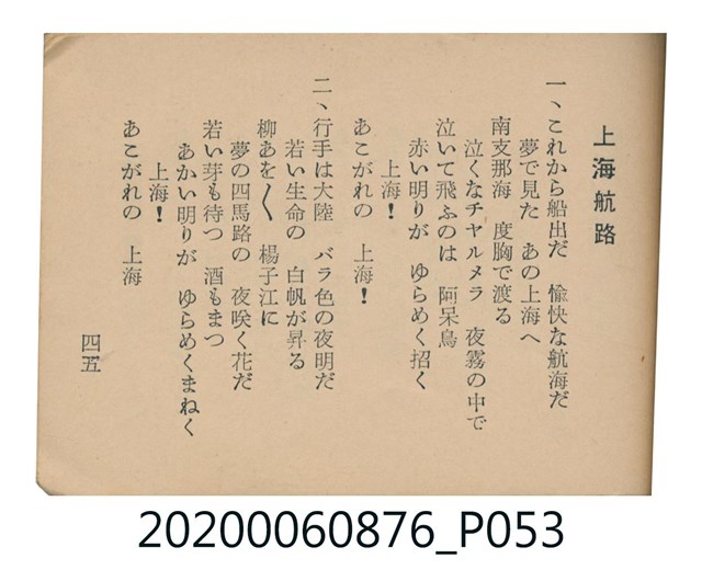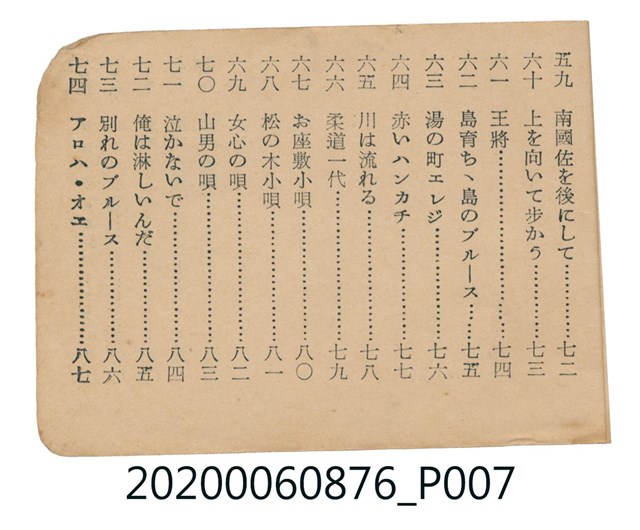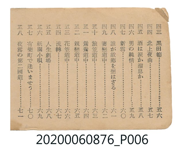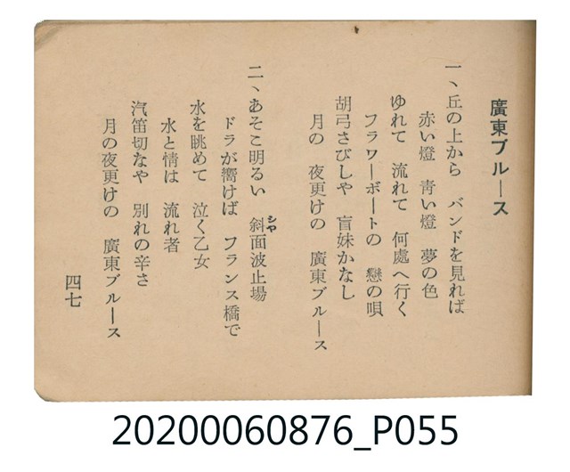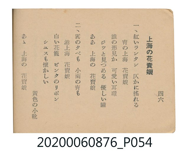 1.本物件為日本航空中日歌謠集,封面上印有中國龍柱與2盞燈籠,上面並寫有「中日歌謠集」,背面則印有日本航空公司台北分公司的住址「臺北市中山北路一段143號」及電話號碼,還有商標,整個物件因收藏關係,有些許斑駁與褪色。