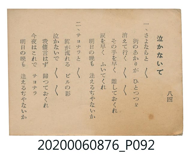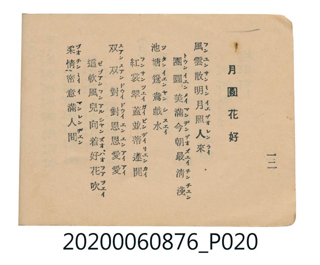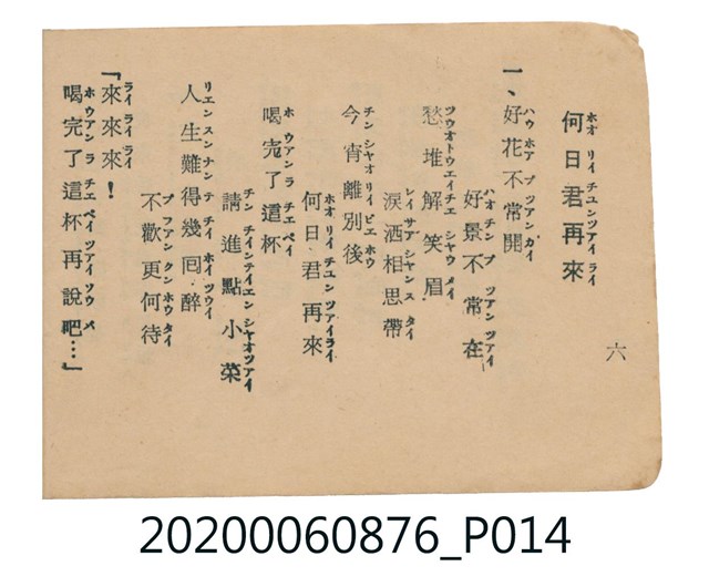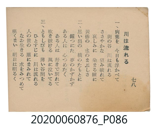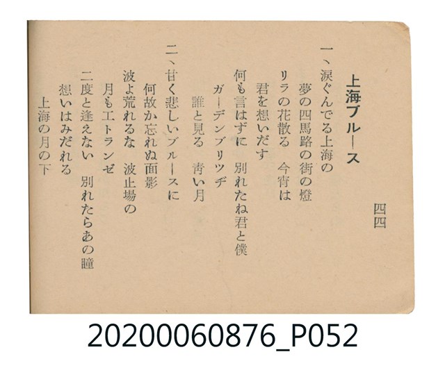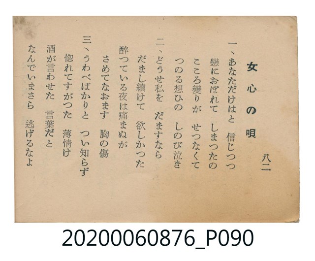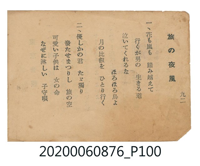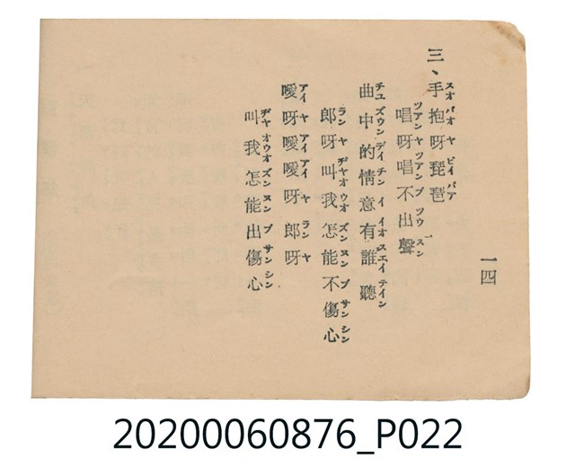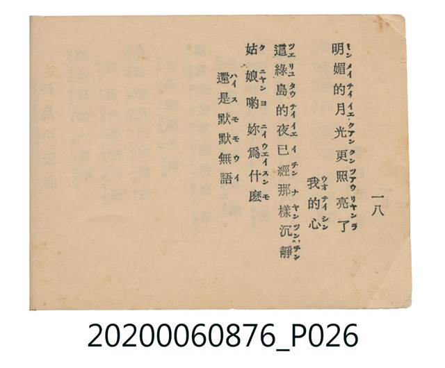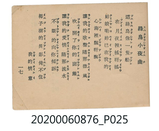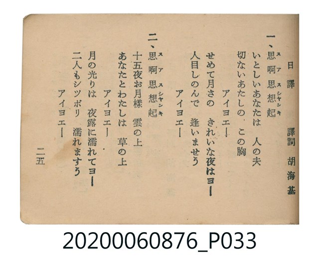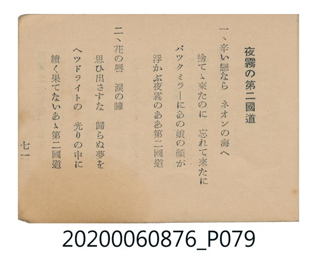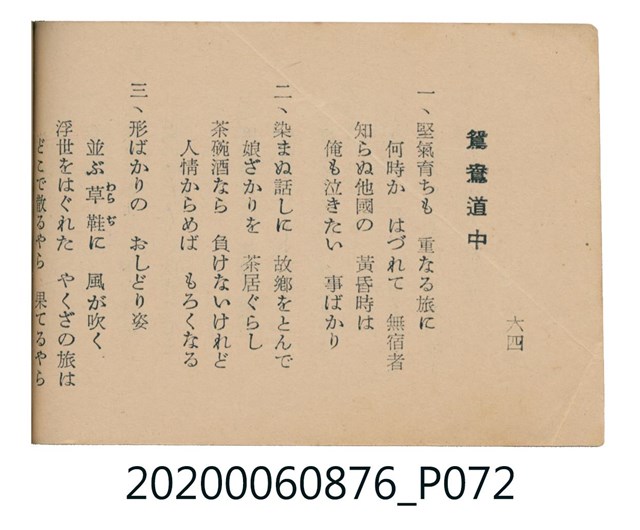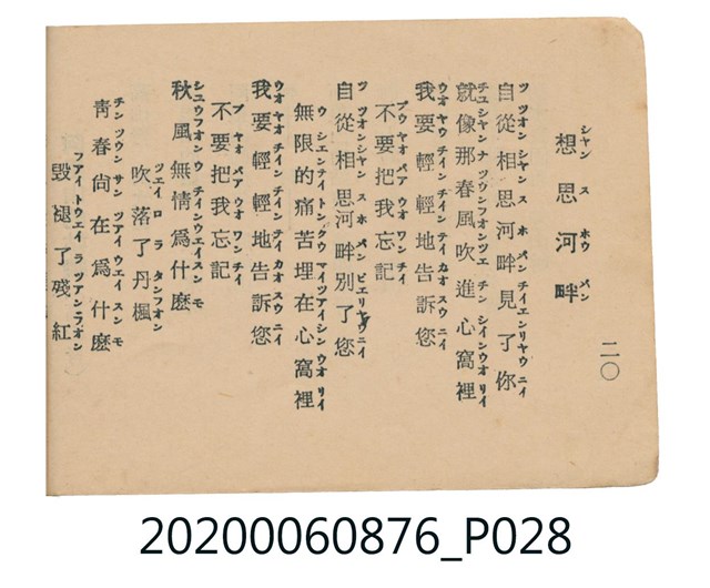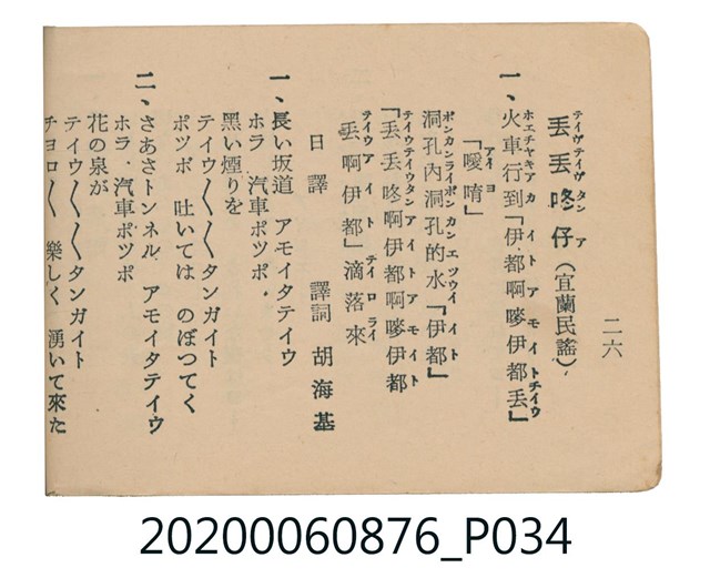 1.本物件為日本航空中日歌謠集,封面上印有中國龍柱與2盞燈籠,上面並寫有「中日歌謠集」,背面則印有日本航空公司台北分公司的住址「臺北市中山北路一段143號」及電話號碼,還有商標,整個物件因收藏關係,有些許斑駁與褪色。