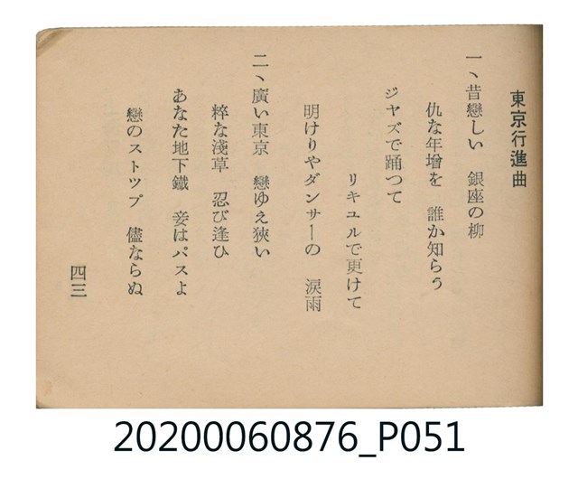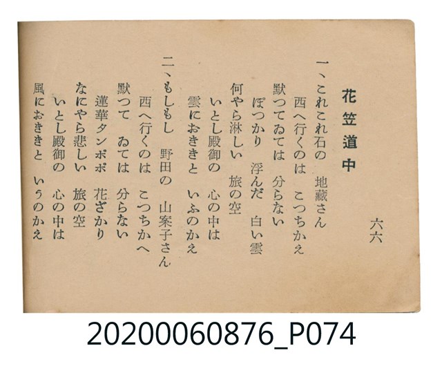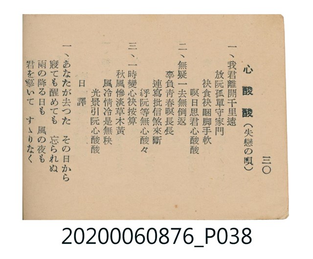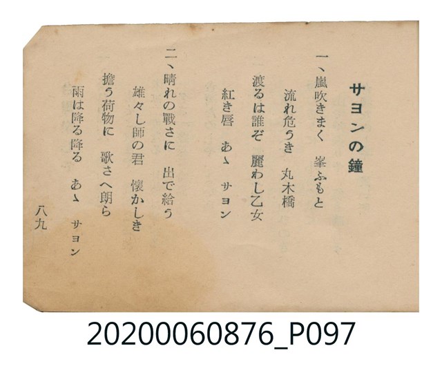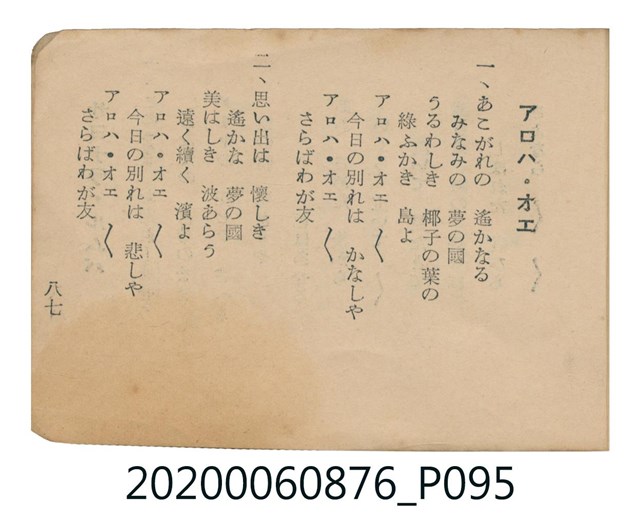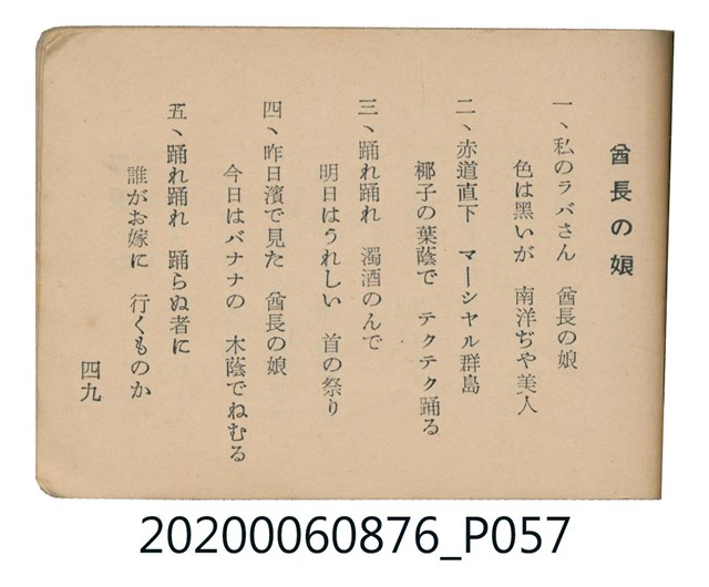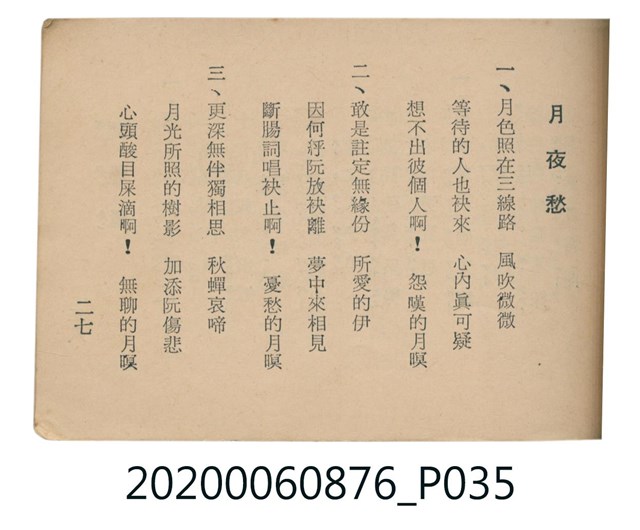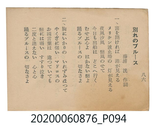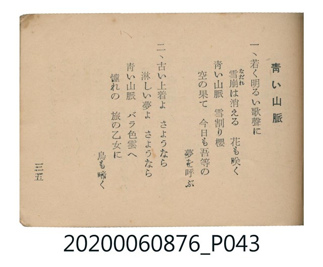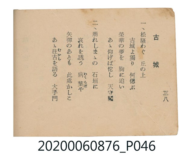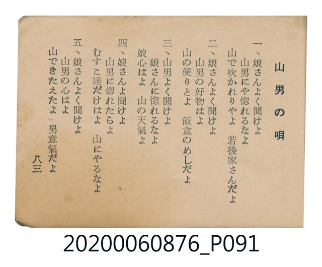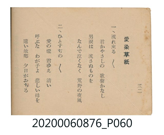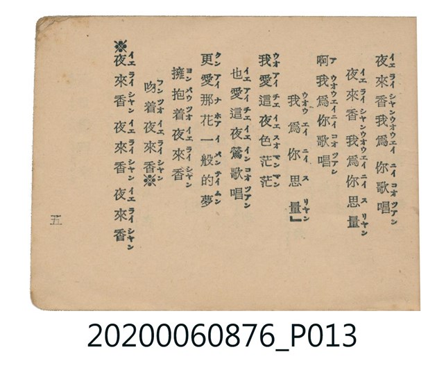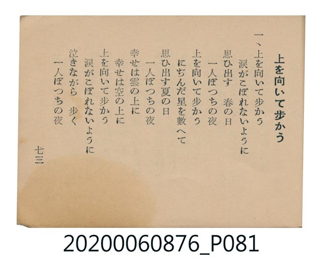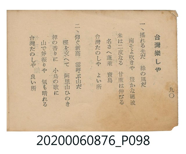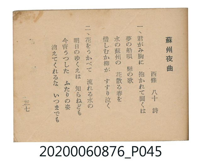 1.本物件為日本航空中日歌謠集,封面上印有中國龍柱與2盞燈籠,上面並寫有「中日歌謠集」,背面則印有日本航空公司台北分公司的住址「臺北市中山北路一段143號」及電話號碼,還有商標,整個物件因收藏關係,有些許斑駁與褪色。