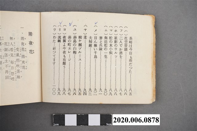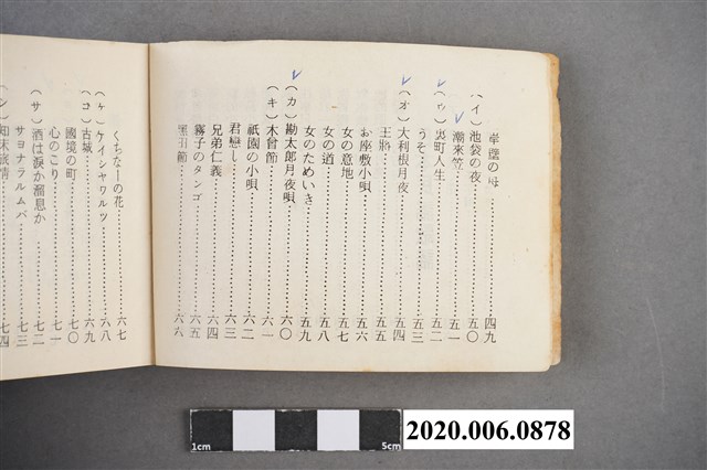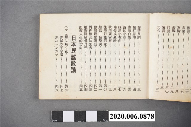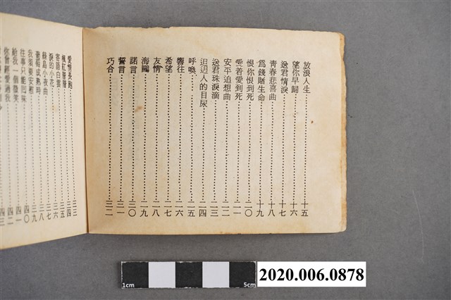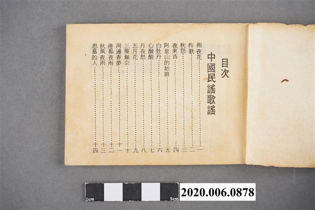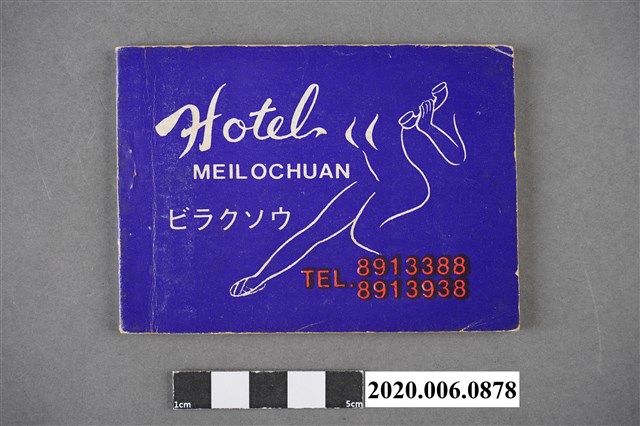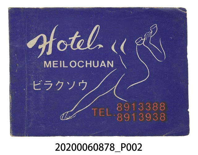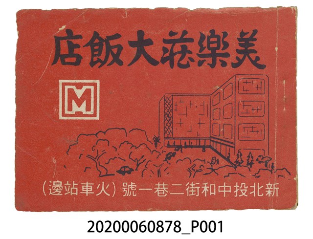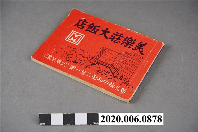 1.本物件為美樂莊大飯店歌本,紅色封面上印有美樂莊大飯店字樣與商標,並畫有美樂莊大飯店的外觀,下方則印有住址「新北投中和街2巷1號(火車站邊)」,背面則印有電話號碼以及英文「Hotel MEIL OCHUAN」,歌本內印有「中國民謠歌謠」」目錄,整個物件因收藏關係,有些許斑駁與褪色。
