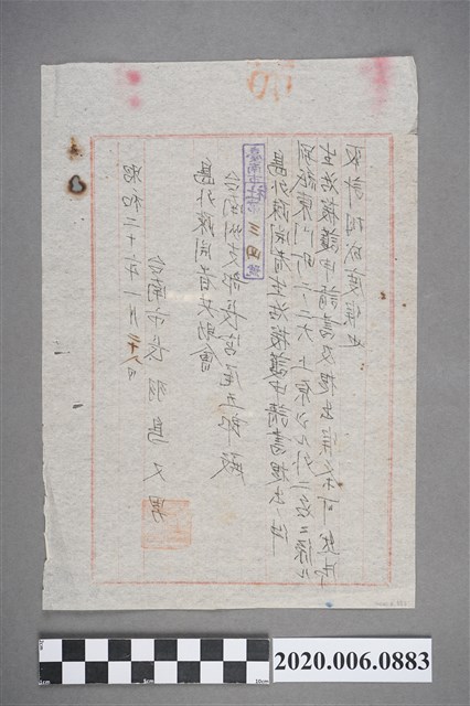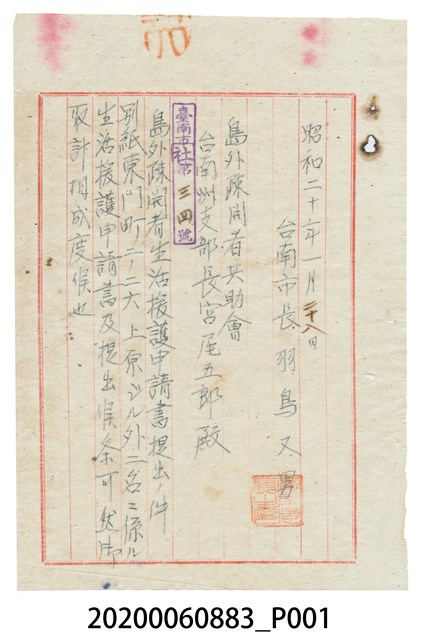 1.本件長18.4公分、寬26.2公分、高0.1公分。文件為臺南市長羽鳥又男給島外疏開者共助會臺南支部長宮尾五郎的公文,主旨為沖繩縣疏開者生活援護相關之件,主要是針對申請人上原ジル的島外疏開民生活援護申請書進行調查,以確認其真實性。 2.疏開是指日本政府有計畫下將人口密集的臺北、基隆、高雄等地的居民疏散至山邊或鄉下,以減少人民受空襲轟炸的死傷。二戰末期,美國在太平洋戰爭採取跳島戰術,佔領菲律賓、攻佔沖繩島,對臺灣指轟炸不佔領。1944年日本政府宣布「疏開綱要」,美軍亦開始空襲臺北至高雄等重要城市,1945年對高雄進行大轟炸。本件即是此背景下產生,原居住於於沖繩縣的島民被疏開至臺灣臺南東門一帶,並經過申請後,其生活費由日本政府負擔。