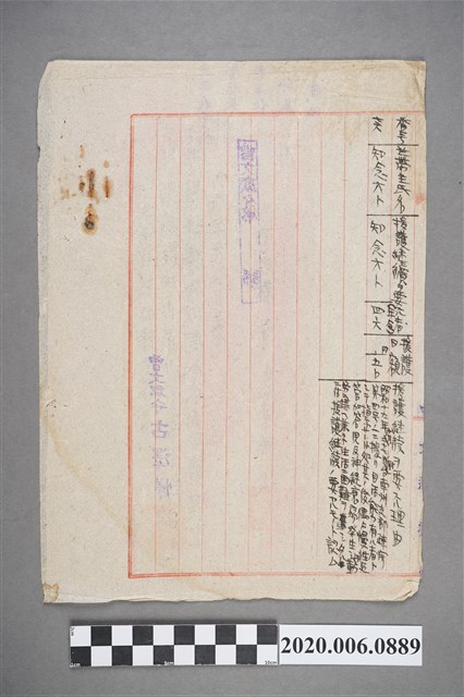 1.本件長18.4公分、寬26.2公分、高0.1公分。文件為曾文郡守古澤悌次給島外疏開者共助會臺南支部長的公文,主旨為沖繩縣疏開者生活援護相關之件,主要是針對申請人的島外疏開民生活援護申請書進行調查,以確認其真實性。 2.疏開是指日本政府有計畫下將人口密集的臺北、基隆、高雄等地的居民疏散至山邊或鄉下,以減少人民受空襲轟炸的死傷。二戰末期,美國在太平洋戰爭採取跳島戰術,佔領菲律賓、攻佔沖繩島,對臺灣指轟炸不佔領。1944年日本政府宣布「疏開綱要」,美軍亦開始空襲臺北至高雄等重要城市,1945年對高雄進行大轟炸。本件即是此背景下產生,原居住於於沖繩縣的島民被疏開至臺灣臺南東門一帶,並經過申請後,其生活費由日本政府負擔。
